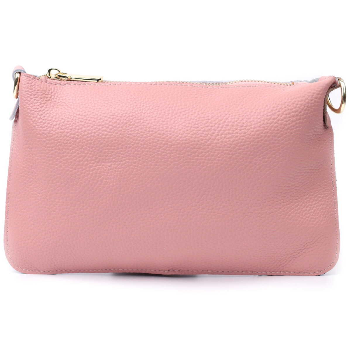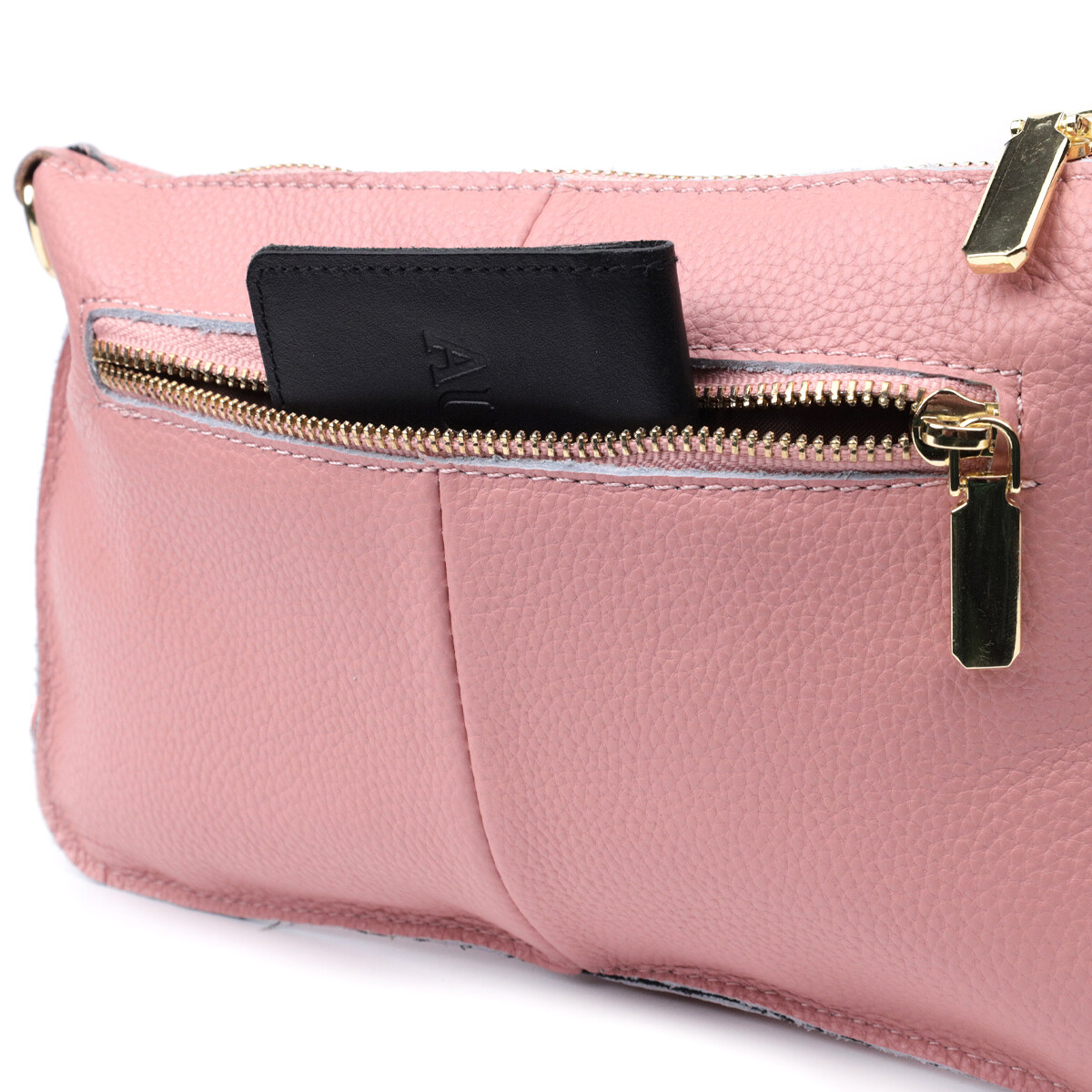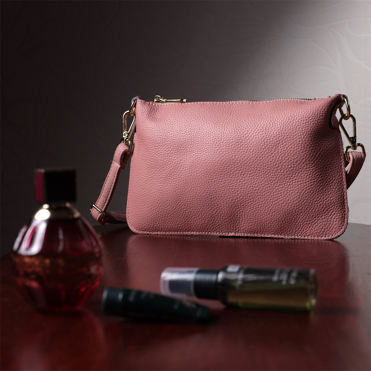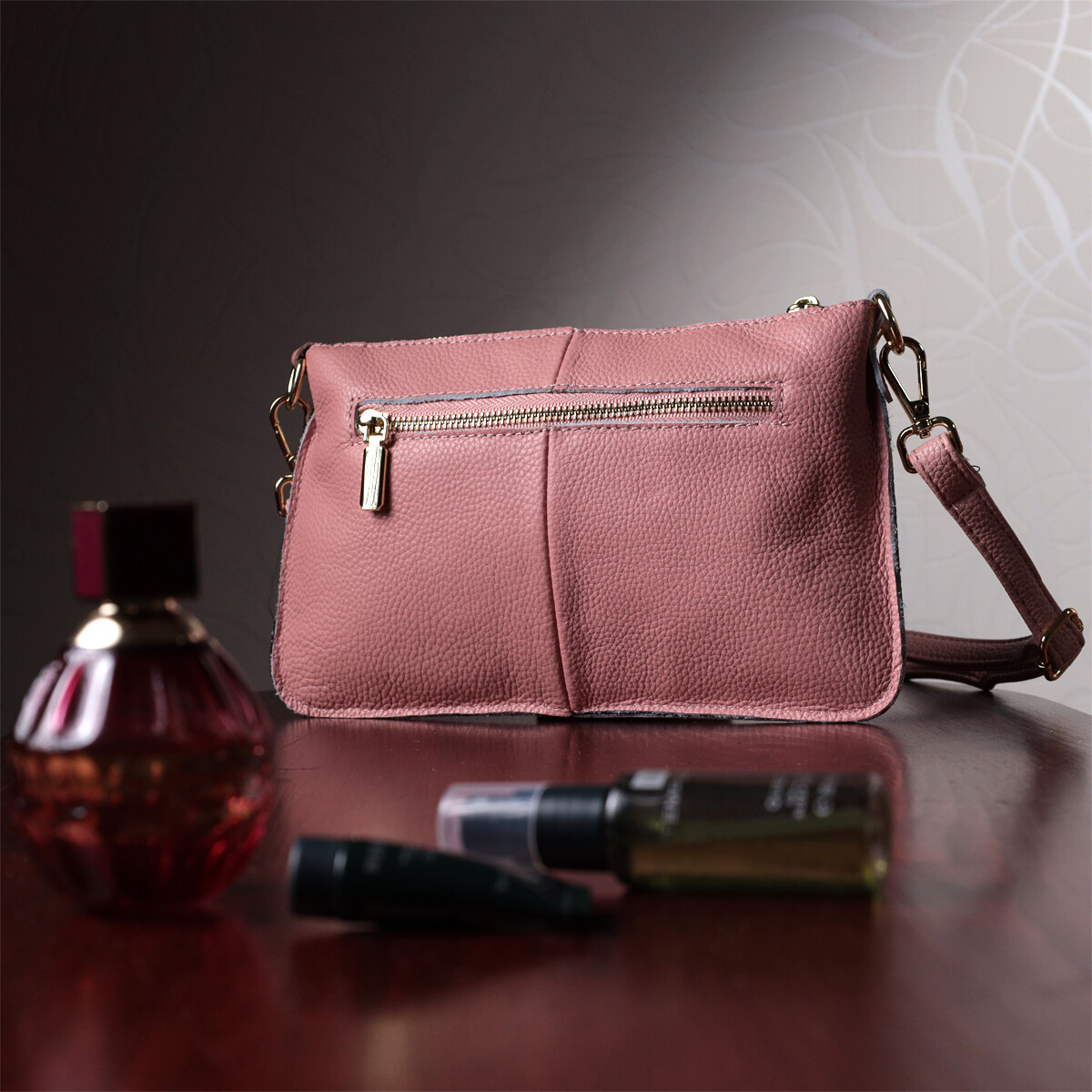 Яскрава жіноча функціональна сумка-клатч із натуральної шкіри. Аксесуар складається з основного відділення, що закривається на блискавку, кишені-перегородки на блискавці всередині та кишені на блискавці на тильній стороні, зовні. Носити сумку можна на плечі і через плече, також можна носити як клатч під рукою і на кисті, для цього є довгий ремінець, що знімається, а також знімний кистьовий ремінь.