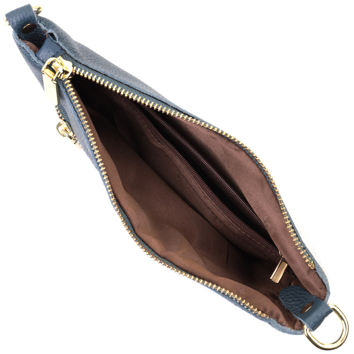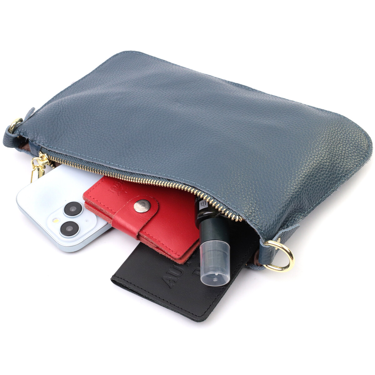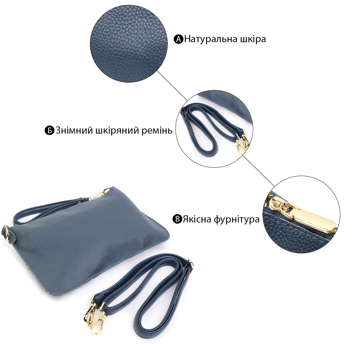Модна жіноча функціональна сумка-клатч із натуральної шкіри. Аксесуар складається з основного відділення, що закривається на блискавку, кишені-перегородки на блискавці всередині та кишені на блискавці на тильній стороні, зовні. Носити сумку можна на плечі і через плече, також можна носити як клатч під рукою і на кисті, для цього є довгий ремінець, що знімається, а також знімний кистьовий ремінь.