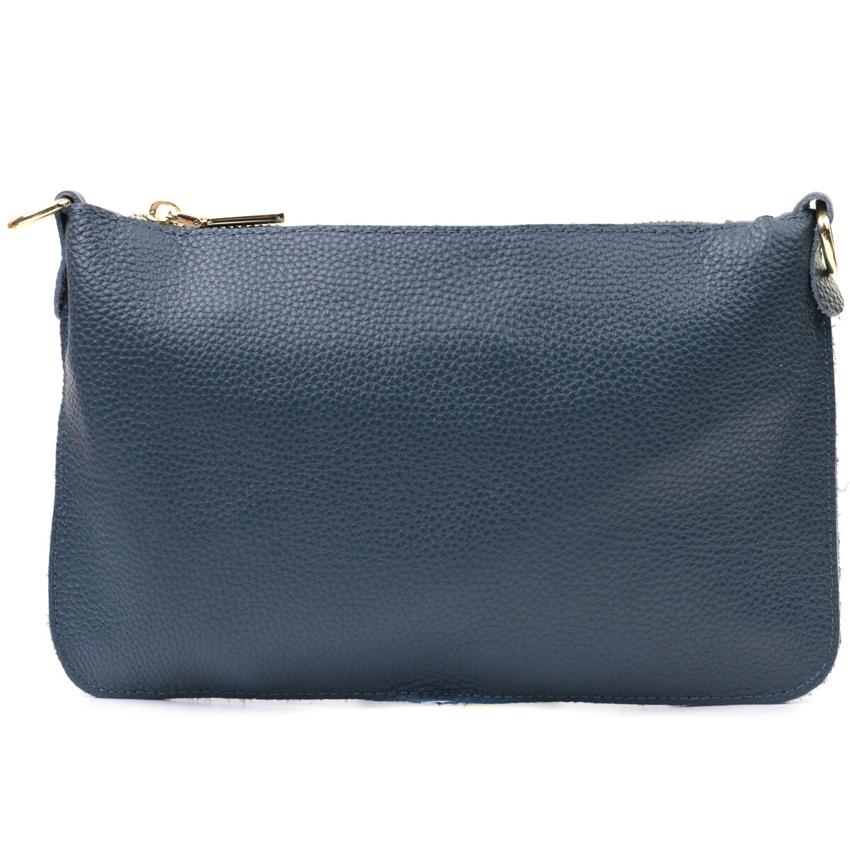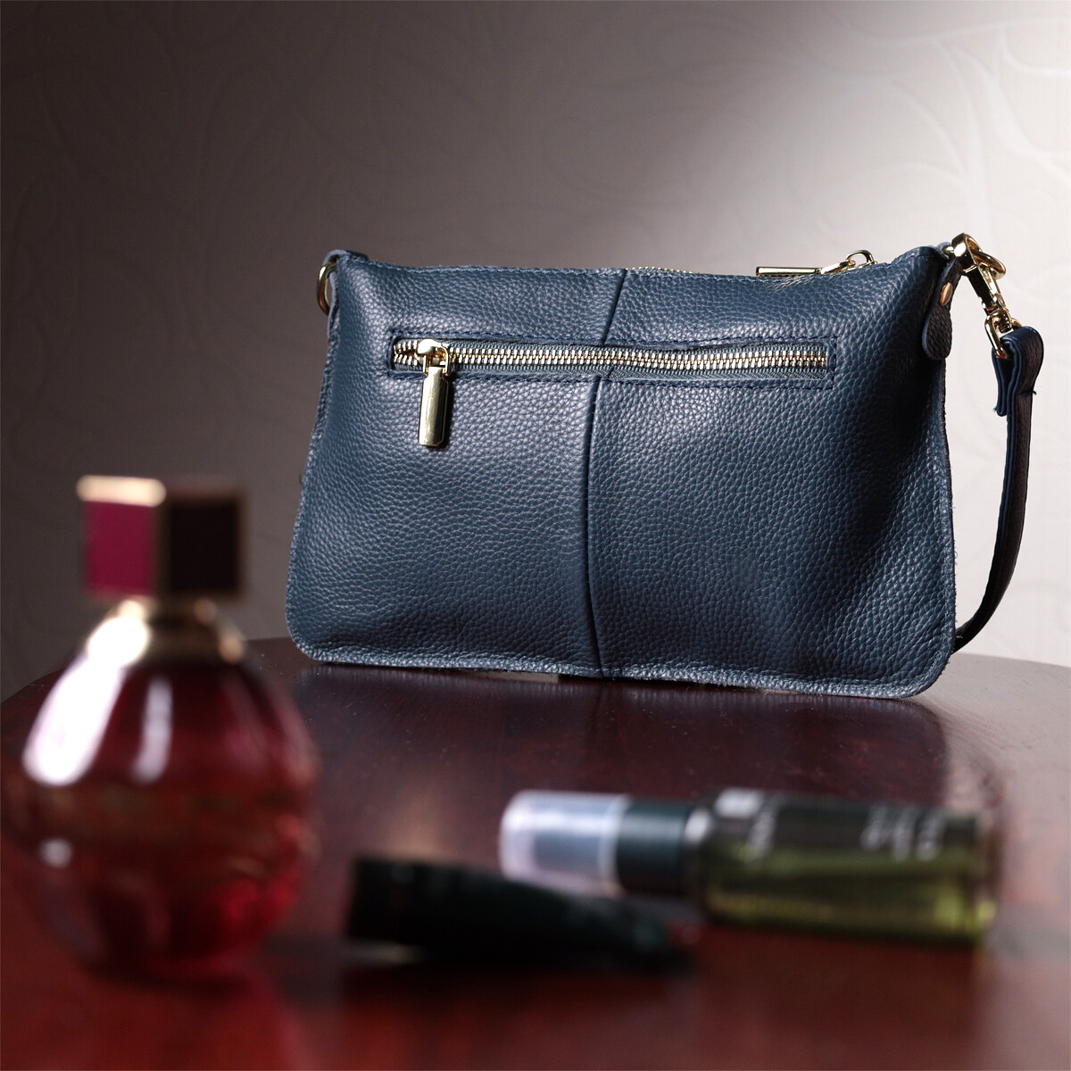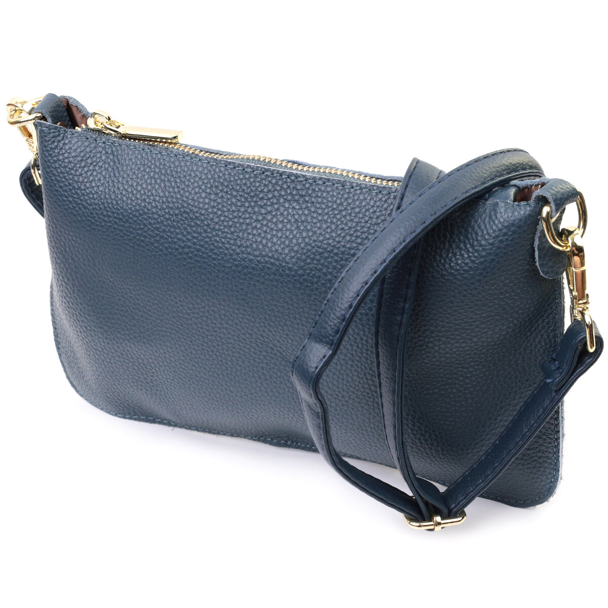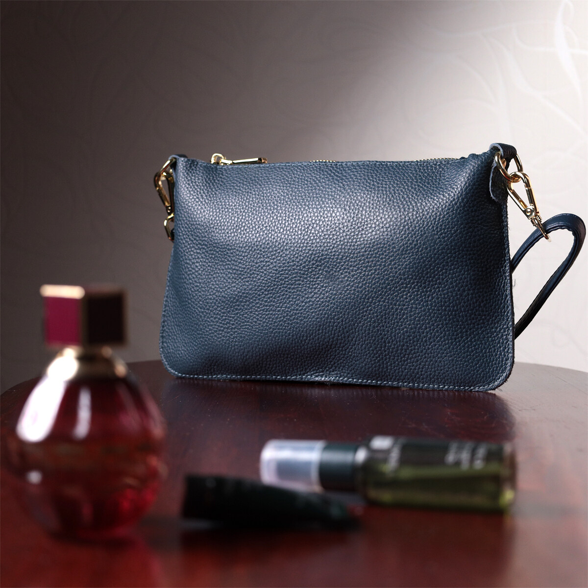 Модна жіноча функціональна сумка-клатч із натуральної шкіри. Аксесуар складається з основного відділення, що закривається на блискавку, кишені-перегородки на блискавці всередині та кишені на блискавці на тильній стороні, зовні. Носити сумку можна на плечі і через плече, також можна носити як клатч під рукою і на кисті, для цього є довгий ремінець, що знімається, а також знімний кистьовий ремінь.
