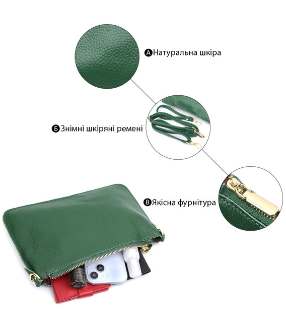 Детальніше Оригінальна жіноча сумка-клатч із двома ременями з натуральної шкіри Vintage 22647 Зелена