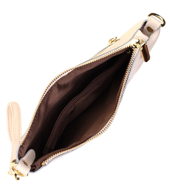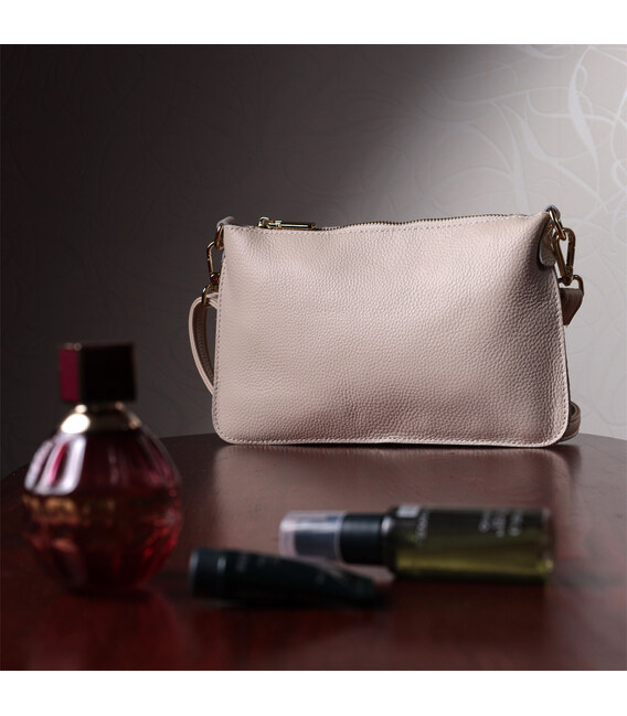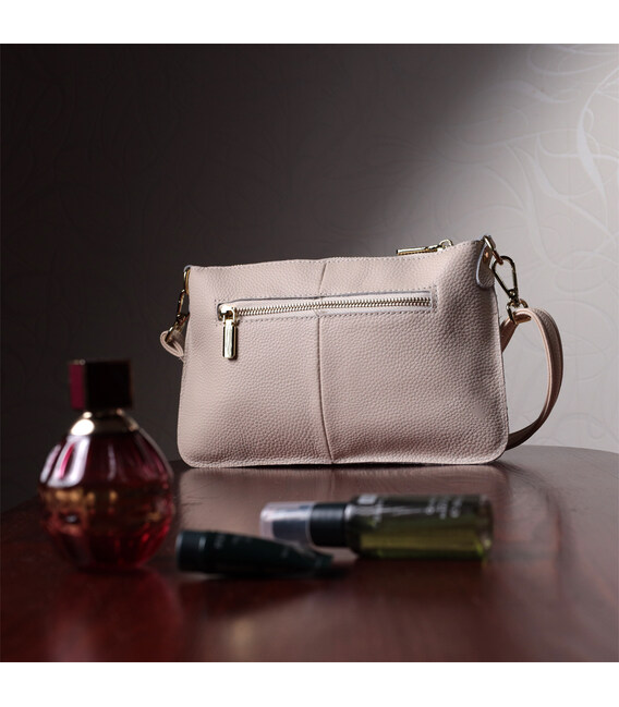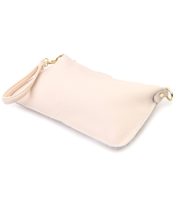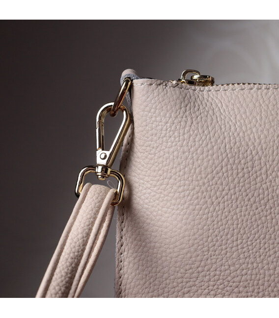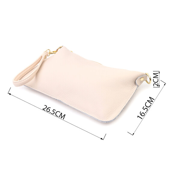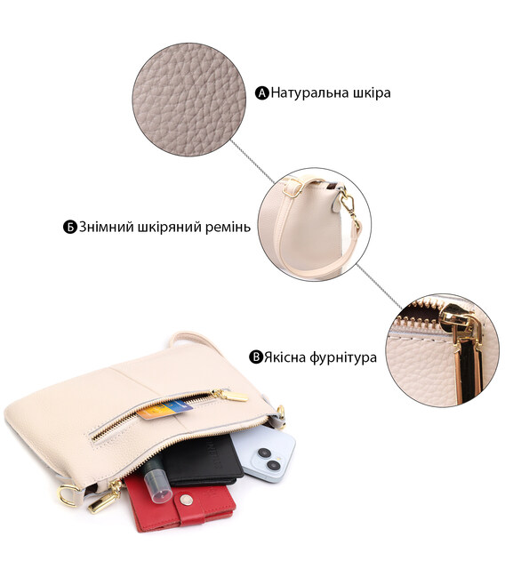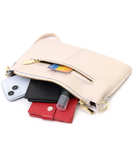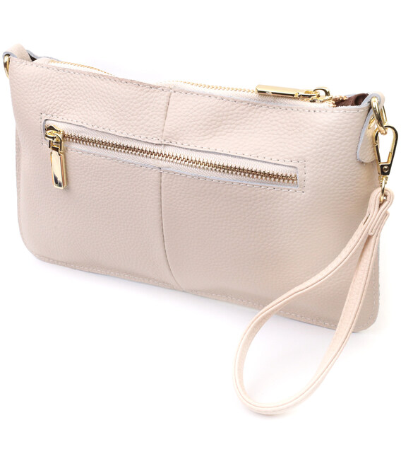 Зручна жіноча функціональна сумка-клатч із натуральної шкіри. Аксесуар складається з основного відділення, що закривається на блискавку, кишені-перегородки на блискавці всередині та кишені на блискавці на тильній стороні, зовні. Носити сумку можна на плечі і через плече, також можна носити як клатч під рукою і на кисті, для цього є довгий ремінець, що знімається, а також знімний кистьовий ремінь.