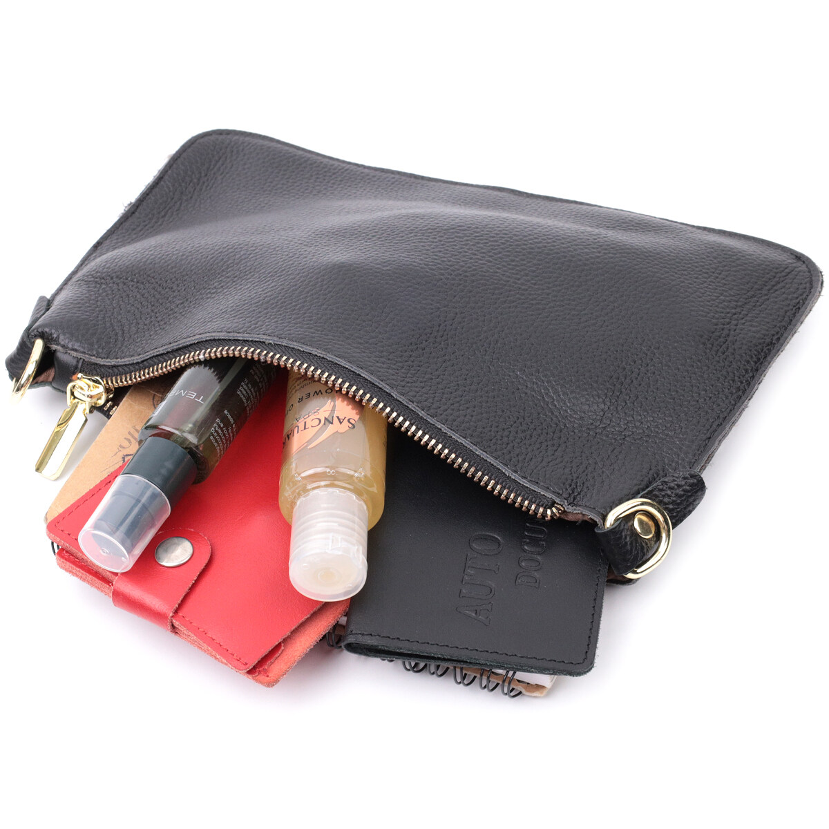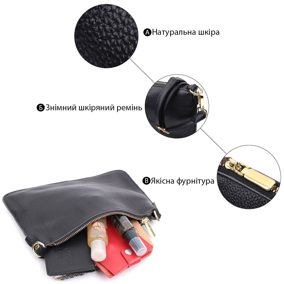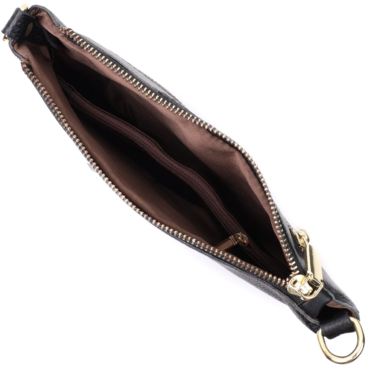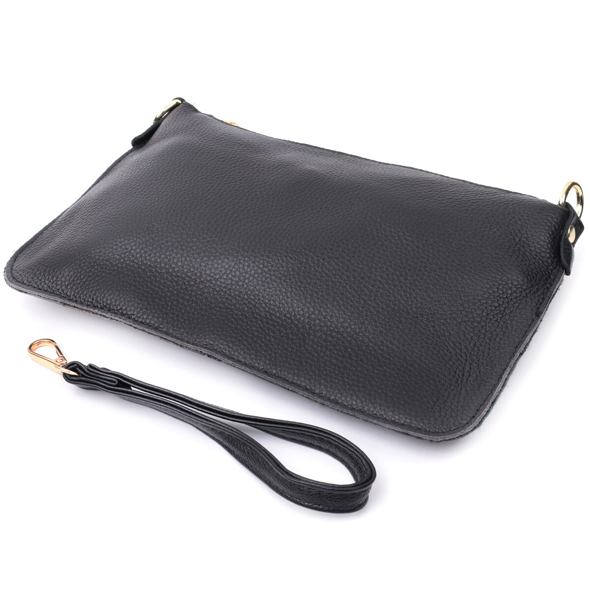 Цікава жіноча функціональна сумка-клатч із натуральної шкіри. Аксесуар складається з основного відділення, що закривається на блискавку, кишені-перегородки на блискавці всередині та кишені на блискавці на тильній стороні, зовні. Носити сумку можна на плечі і через плече, також можна носити як клатч під рукою і на кисті, для цього є довгий ремінець, що знімається, а також знімний кистьовий ремінь.