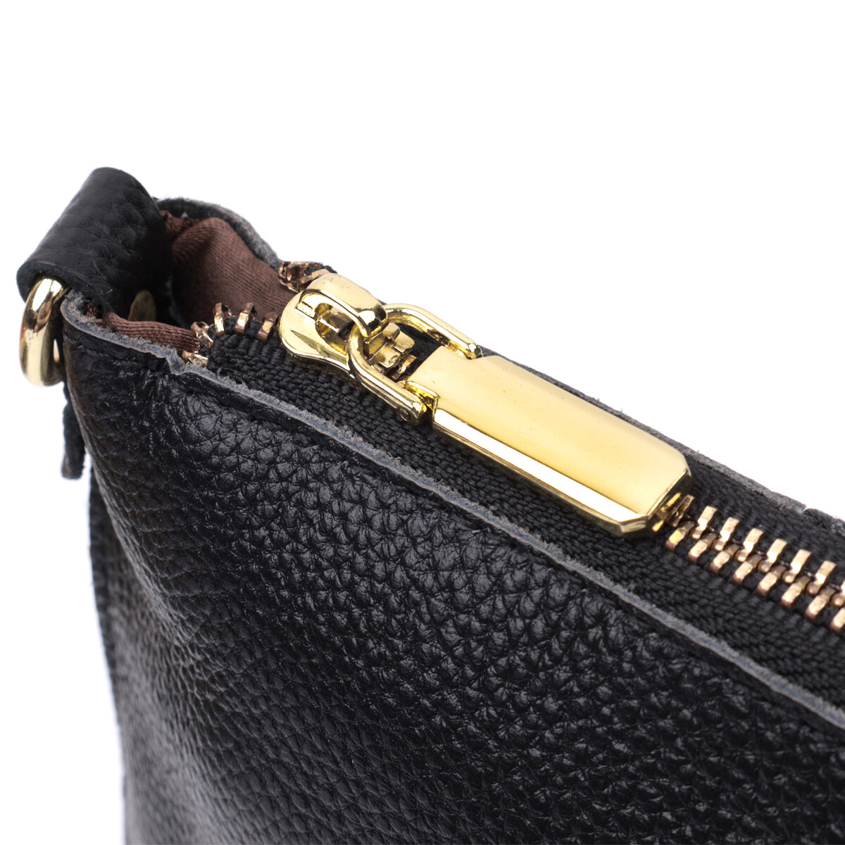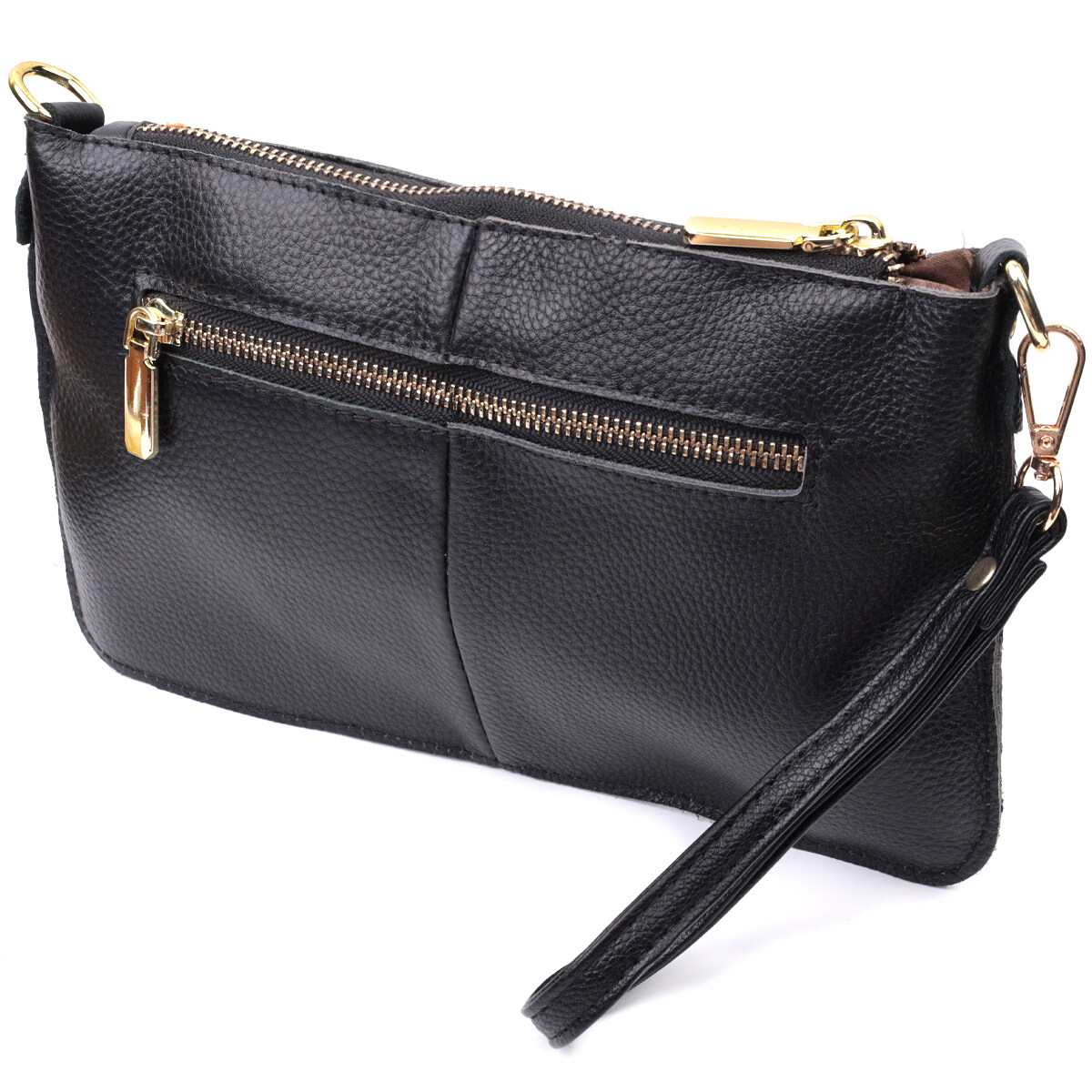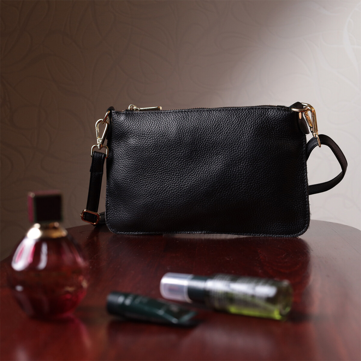 Цікава жіноча функціональна сумка-клатч із натуральної шкіри. Аксесуар складається з основного відділення, що закривається на блискавку, кишені-перегородки на блискавці всередині та кишені на блискавці на тильній стороні, зовні. Носити сумку можна на плечі і через плече, також можна носити як клатч під рукою і на кисті, для цього є довгий ремінець, що знімається, а також знімний кистьовий ремінь.