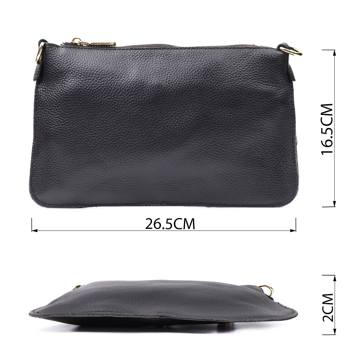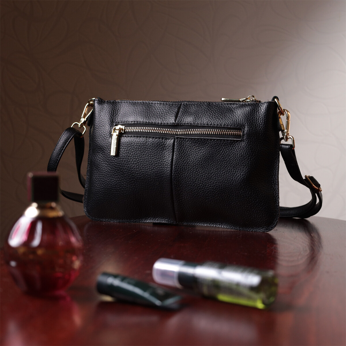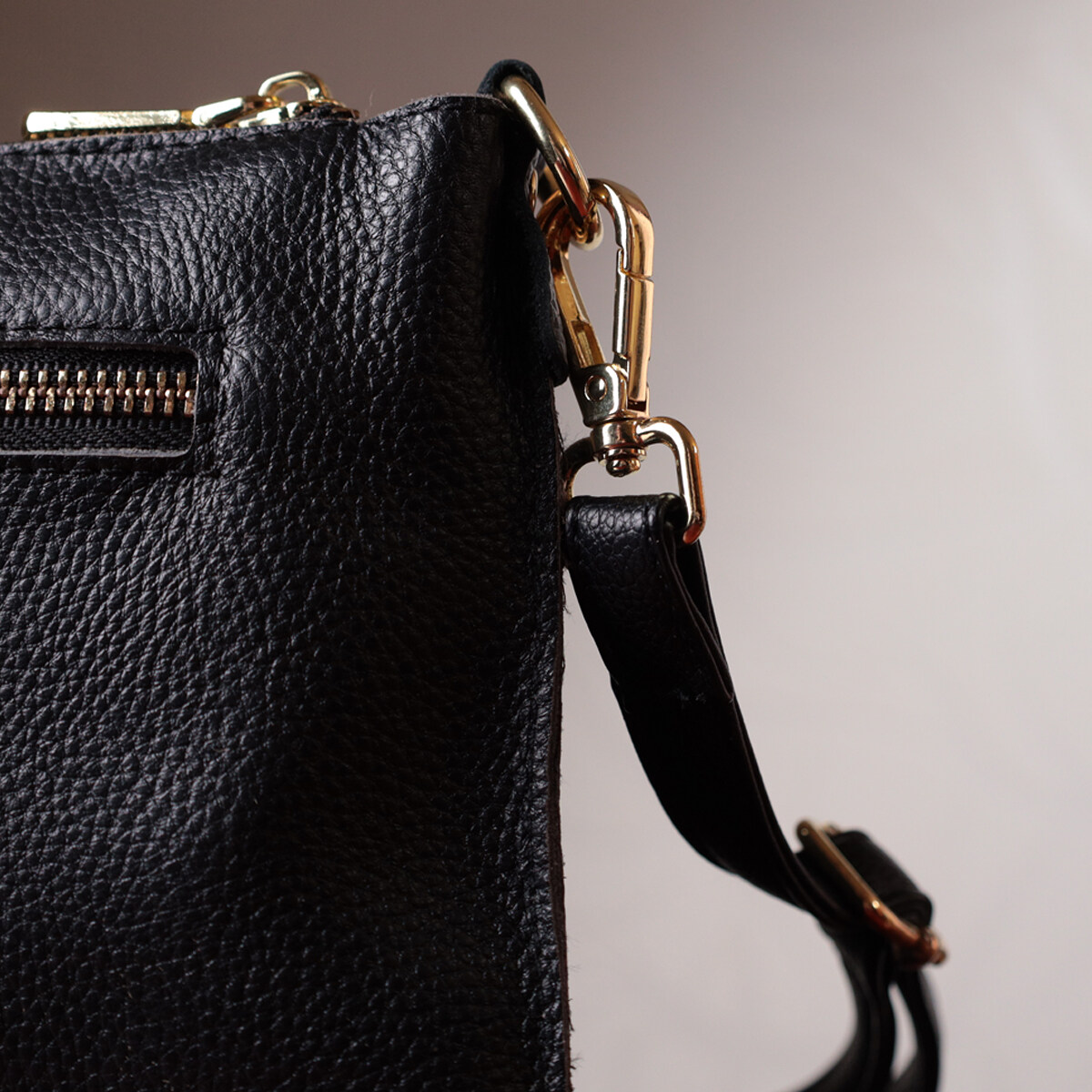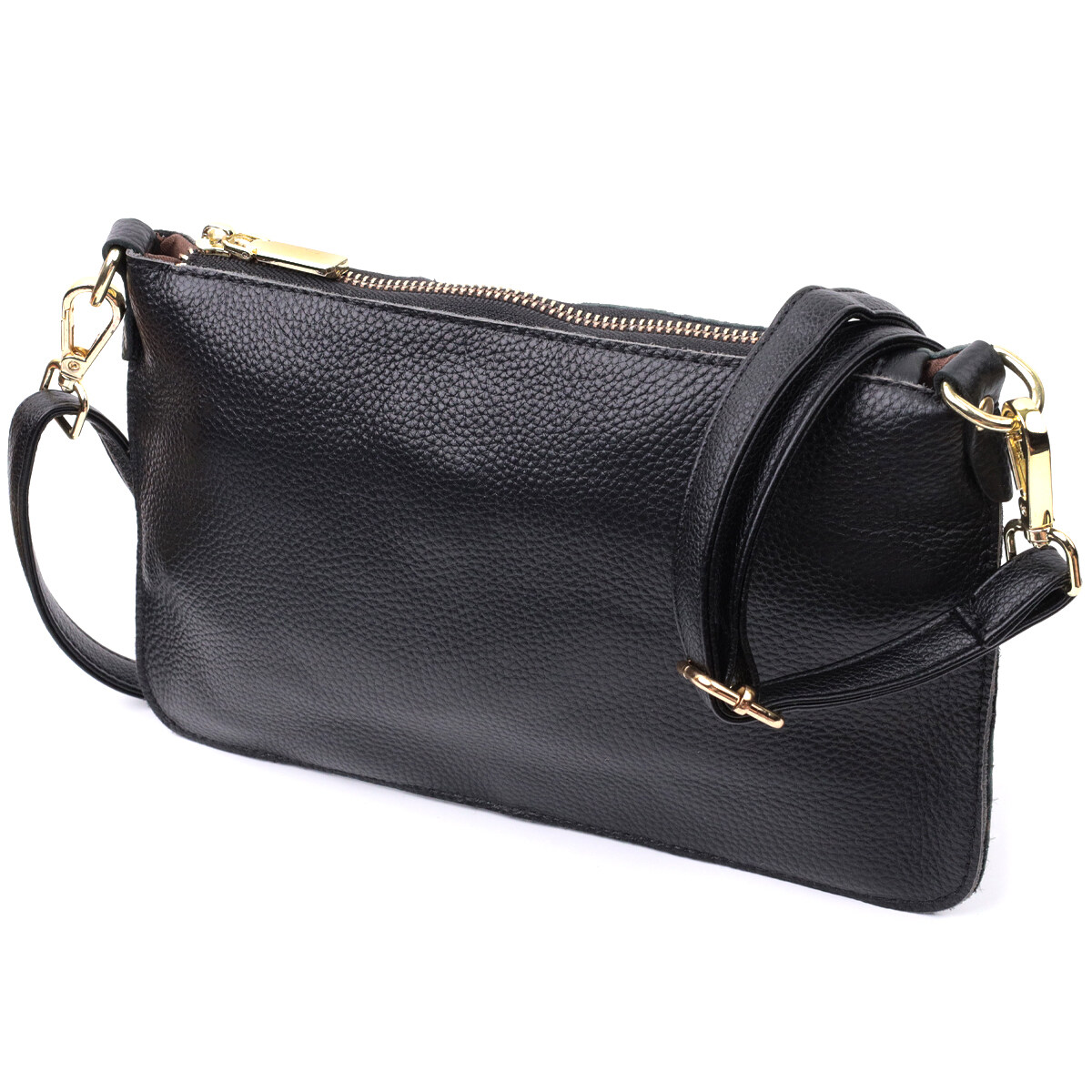 Цікава жіноча функціональна сумка-клатч із натуральної шкіри. Аксесуар складається з основного відділення, що закривається на блискавку, кишені-перегородки на блискавці всередині та кишені на блискавці на тильній стороні, зовні. Носити сумку можна на плечі і через плече, також можна носити як клатч під рукою і на кисті, для цього є довгий ремінець, що знімається, а також знімний кистьовий ремінь.