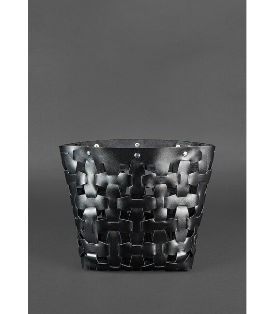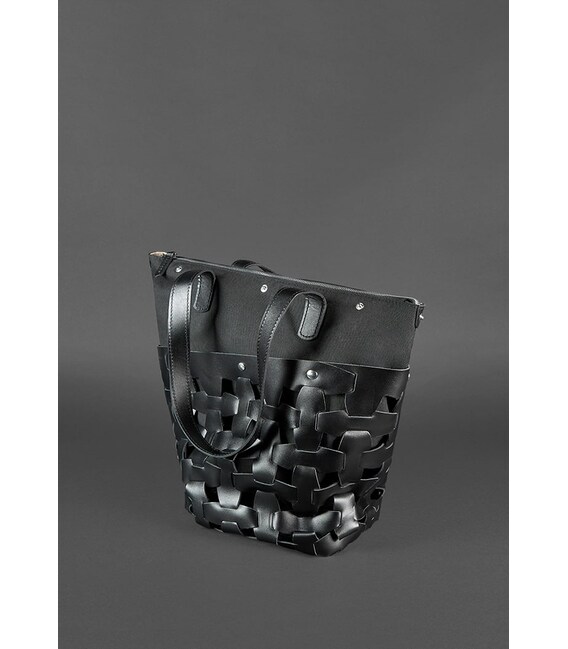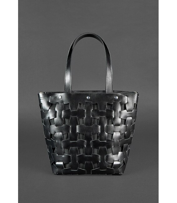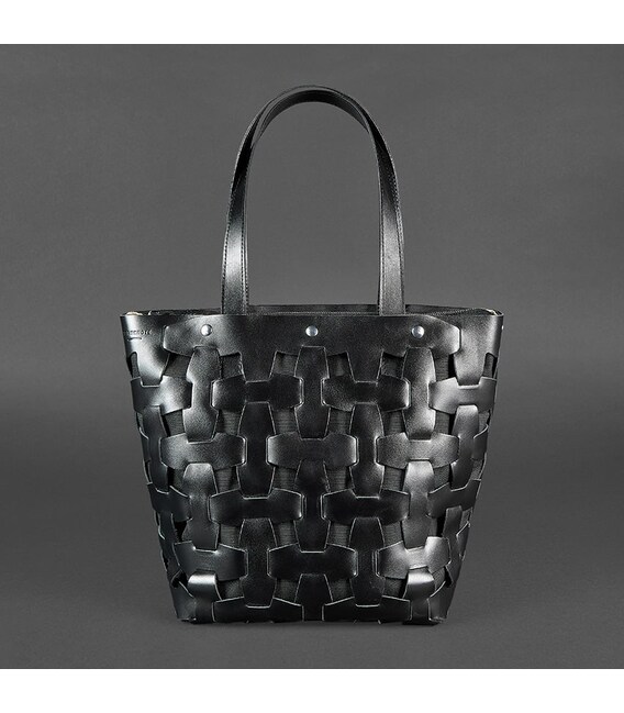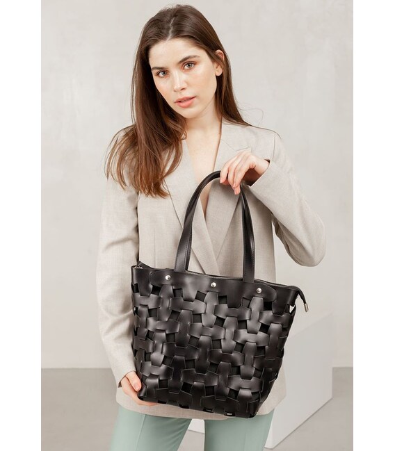 Стильний шоппер середнього розміру стане оригінальним доповненням повсякденного образу. Виконано аксесуар з гладкої натуральної шкіри насиченого чорного кольору. Шкіряні смужки з'єднуються за принципом пазлів, формуючи верхній каркас сумки.