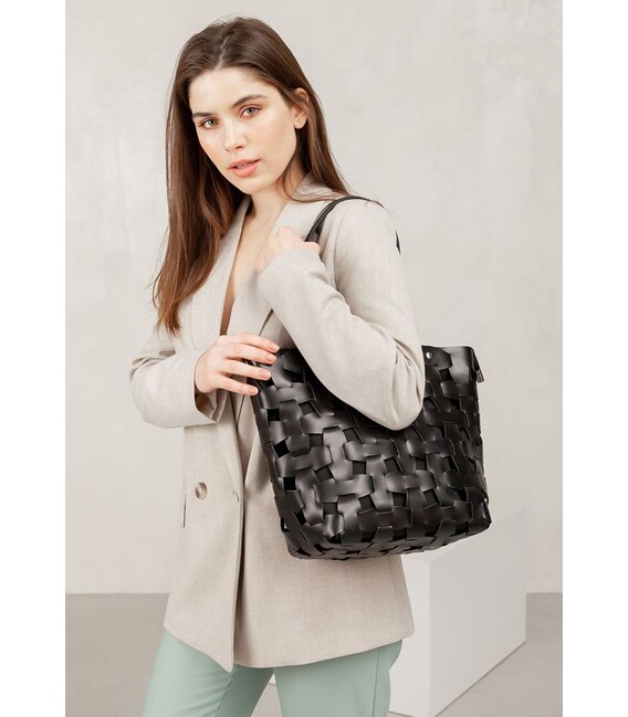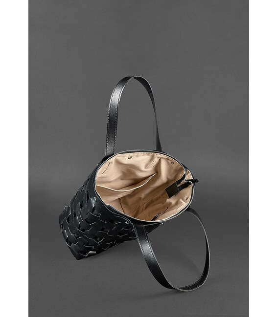 Шкіряна плетена жіноча сумка Пазл L вугільно-чорна