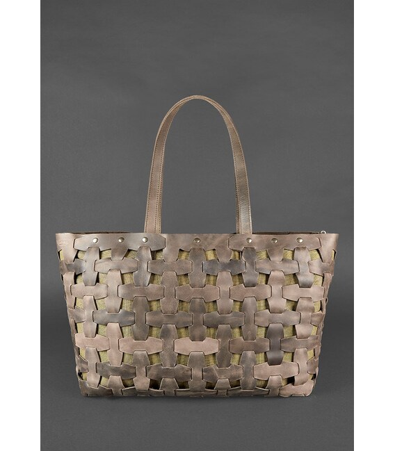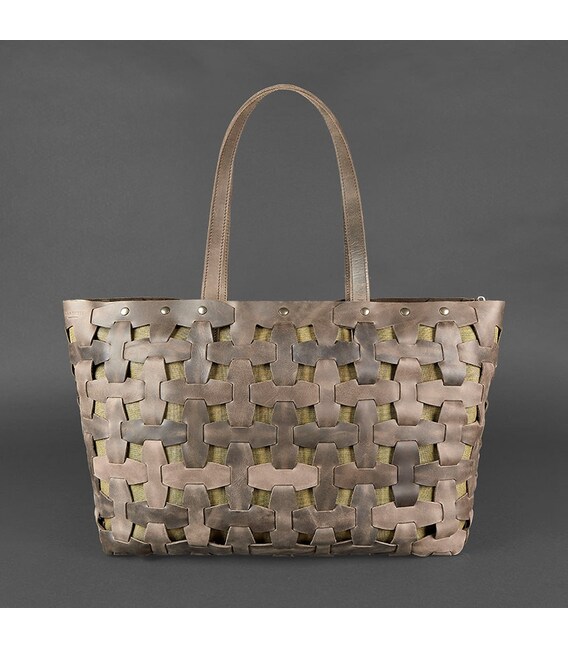 Каркас сумки виготовлений з щільних шкіряних смужок, які з'єднуються за принципом пазлів, формуючи стильне плетіння. Для виготовлення каркаса використовувалася шкіра Crazy Horse з вінтажним ефектом в кольорі горіх.
