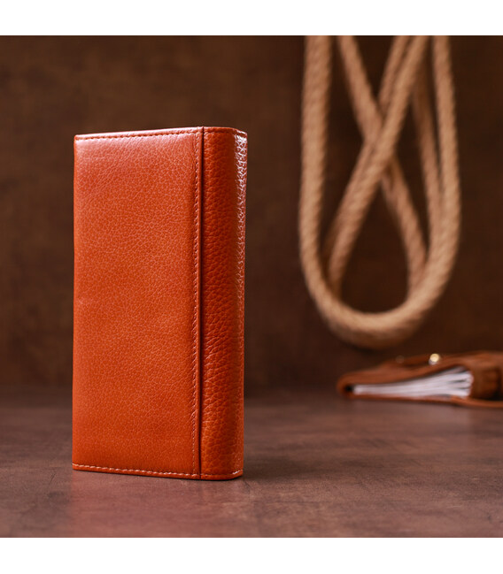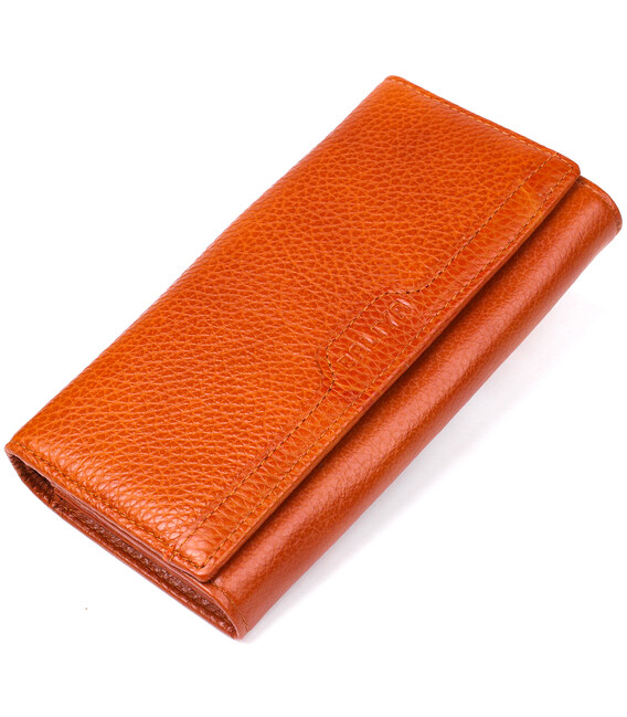 Жіночий шкіряний гаманець горизонтального типу з натуральної шкіри яскравого оранжевого кольору. Аксесуар приємний і м'який на дотик. По краях прошитий рівним рядком. На лицьовій стороні, на клапані, є тиснення бренду. Виріб доповнено найнеобхіднішим функціоналом: монетницею з міцним фіксатором, слотами для карток і просторими відділеннями під купюри. У нашому магазині ви зможете знайти дану модель в різних кольорах і схожих дизайнах за найдоступнішою вартості. Такий гаманець стане прекрасним подарунком для будь-якої дівчини.