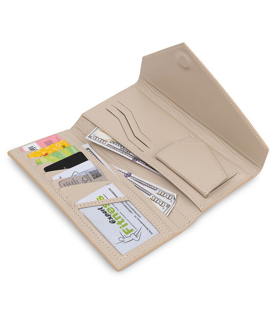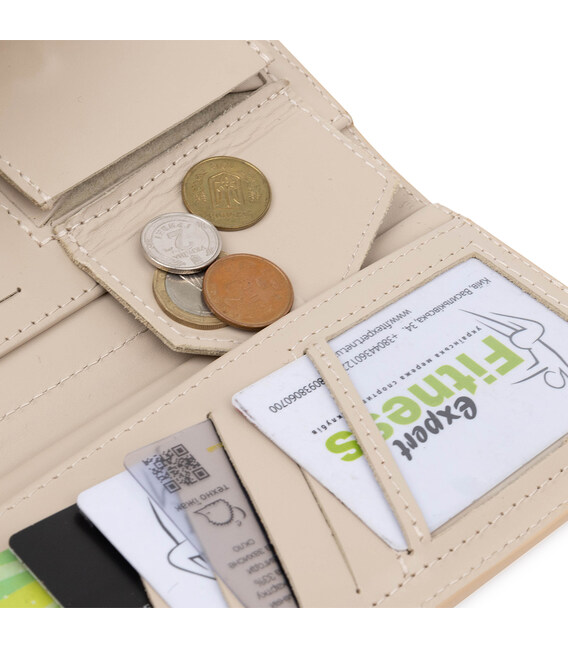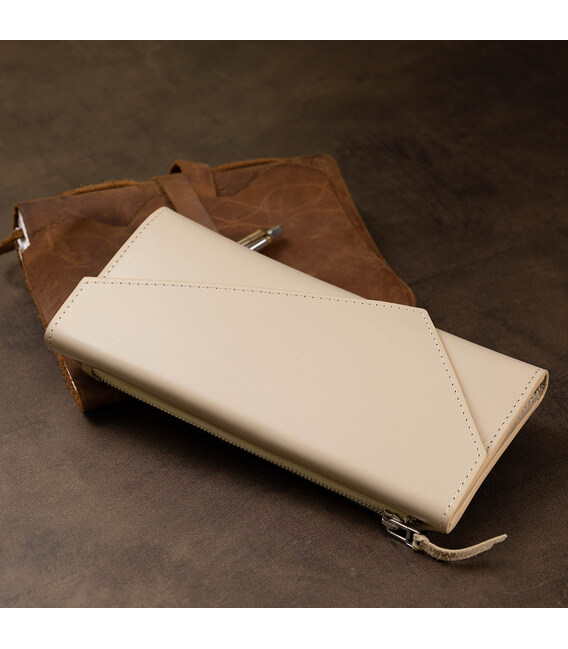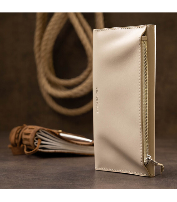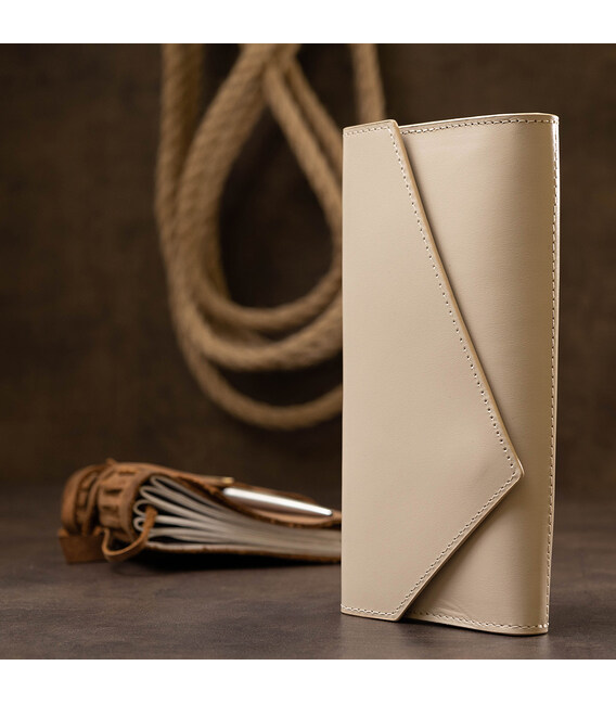 Місткий оригінальний жіночий гаманець, який також можна застосовувати у вигляді клатча. Виконано в красивому бежевому кольорі, тому підійде під будь-який одяг. Матеріал виготовлення - натуральна високоякісна шкіра з високою стійкістю до зносу. Наповнення представлено у вигляді зручних відділень для купюр, монет, різних карток і інших цінних речей. Упакований аксесуар в фірмовий чохол.