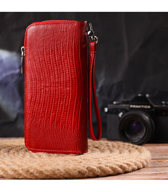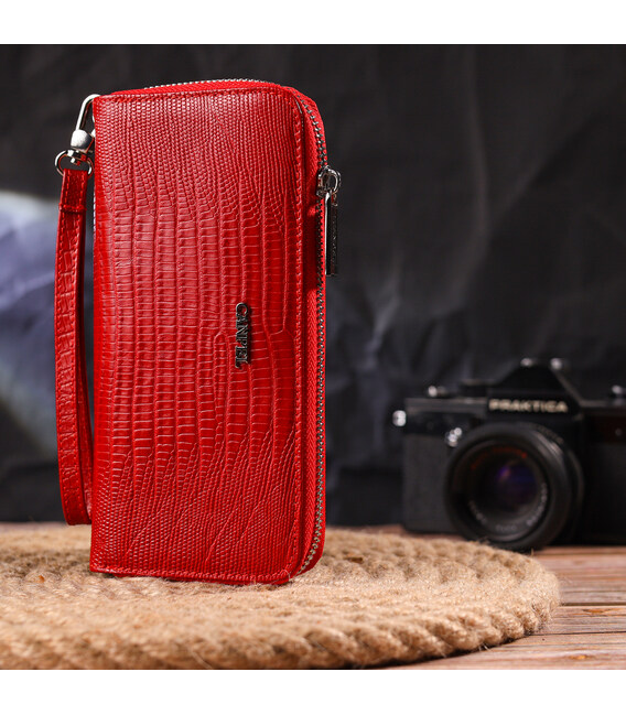 Яскравий жіночий гаманець із натуральної фактурної шкіри. Аксесуар має три основні відділення, в які поміщаються купюри всіх номіналів, дві перегородки, одна з них на блискавці, вісім кишень для карток, дві прилеглі кишені та знімний кистьовий ремінь. Закривається аксесуар на блискавку. Відмінний аксесуар, надійний виробник, який прослужить дуже довго.