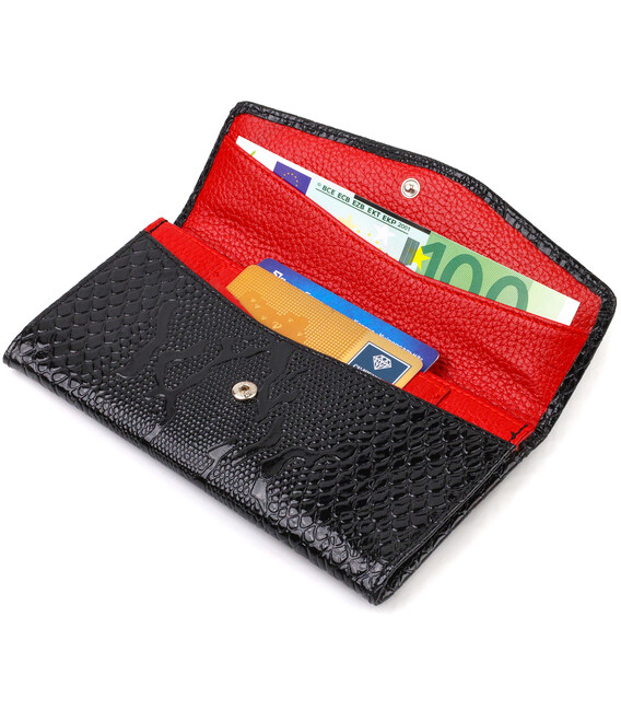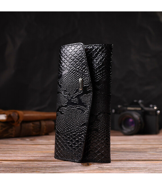 Чорний лакований жіночий гаманець горизонтального типу із якісної натуральної шкіри з тисненням під рептилію. Аксесуар має одне основне відділення, шість кишень для карток, чотири прилеглі кишені та монетницю. Закривається аксесуар навпіл клапаном на кнопку. Купуючи шкіряний аксесуар цієї фірми, собі або на подарунок, будьте певні, що він прослужить Вам не один рік.