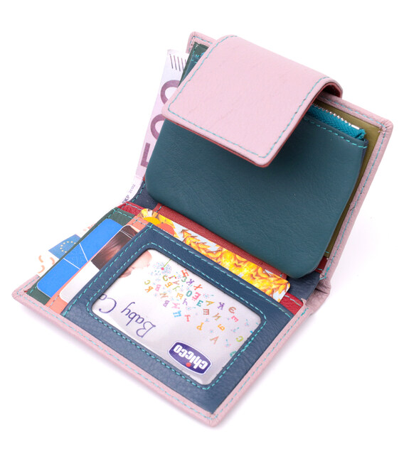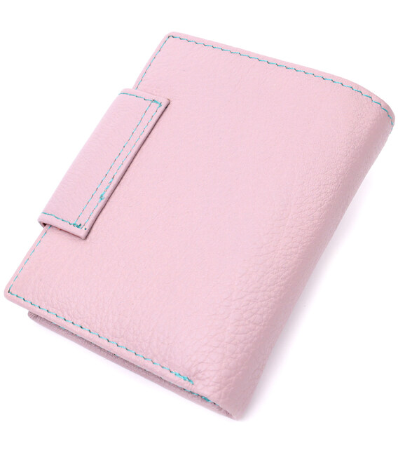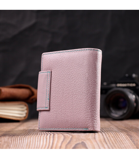 Красиве вертикальне портмоне в два складки зручного розміру з натуральної шкіри найвищої якості. Гаманець бежево-рожевого кольору зовні та різнобарвний усередині, що дуже стильно та сучасно. Шкіряне портмоне дуже практичне і служить досить довго. Аксесуар складається з основного відділення зі шкіряною перегородкою для купюр, монетниці, чотирьох осередків для карт, прозорого віконця для пропуску та чотирьох прихованих кишень. Портмоне доповнено надійною фурнітурою і прошито по краю рівним рядком бірюзового кольору. Укомплектований гаманець у фірмову картонну коробку білого кольору. Виріб стане ідеальним подарунком для дівчини будь-якого віку.
