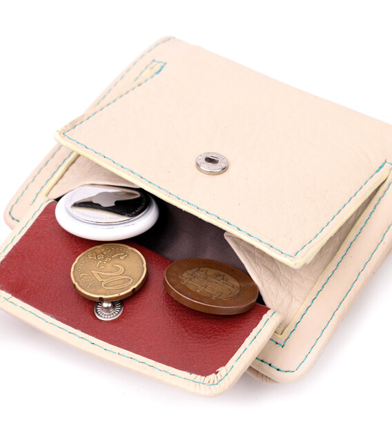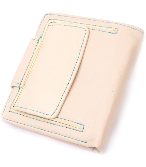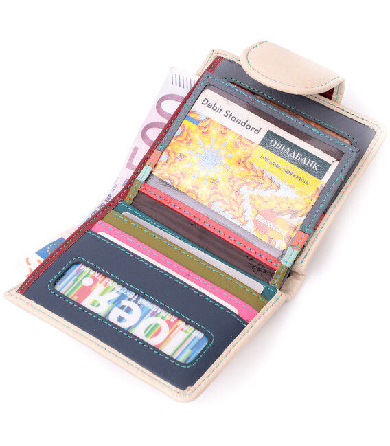 Відмінне вертикальне портмоне в два складки зручного розміру з натуральної шкіри найвищої якості. Гаманець кремово-білого кольору зовні та різнобарвний усередині, що дуже стильно та сучасно. Шкіряне портмоне дуже практичне і служить досить довго. Аксесуар складається з основного відділення зі шкіряною перегородкою для купюр, кишені на блискавці через всю довжину, монетниці, дев'яти осередків для карт, прозорого віконця для пропуску та трьох прихованих кишень. Портмоне доповнено надійною фурнітурою і прошито по краю рівним рядком бірюзового кольору. Укомплектований гаманець у фірмову картонну коробку білого кольору. Виріб стане ідеальним подарунком для дівчини будь-якого віку.