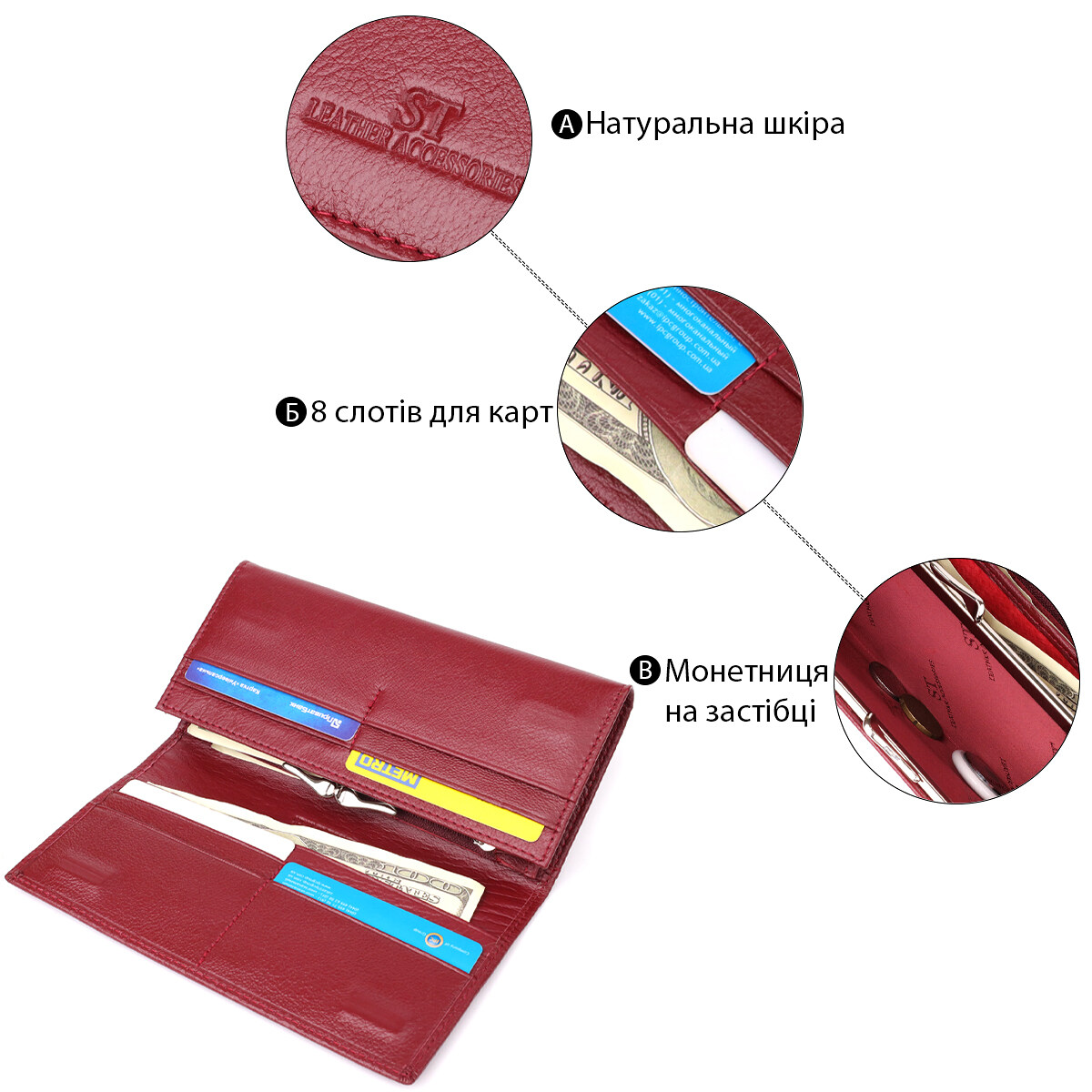 Класичне жіноче портмоне у два складення з натуральної шкіри найвищої якості. Шкіряне портмоне дуже практичне і служить досить довго. Аксесуар складається з трьох містких кишень для купюр, кишені на блискавці через всю довжину, восьми осередків для пластикових карток, прихованої кишені та кишені на механічній клямці, що відмінно прослужить для монет. Портмоне доповнено надійною фурнітурою. Укомплектований гаманець у фірмову картонну коробку білого кольору.