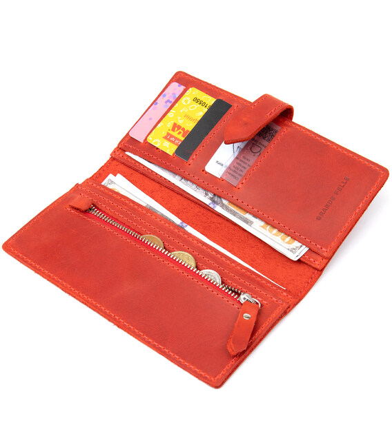 Чудове високоякісне портмоне в красивому червоному кольорі, що виглядає дуже жіночно і стильно. Фактура виробиу - вінтажна з ефектом старовини. Усередині присутні місткі відділення для купюр, кредитних карт і монет. Даний аксесуар стане прекрасним подарунком для будь-якої жінки.