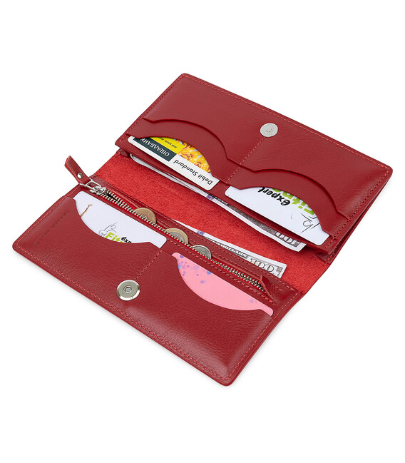 Цікаве жіноче вертикальне портмоне з натуральної шкіри з відмінними експлуатаційними характеристиками. Має гарний насичений червоний колір і гладку глянсову фактуру. Всередині є місткі відділення для купюр, кредитних і візитних карток і кишеня на блискавці для дрібниць або іншого. Упакований гаманець в фірмову коробку.