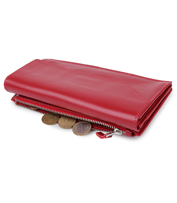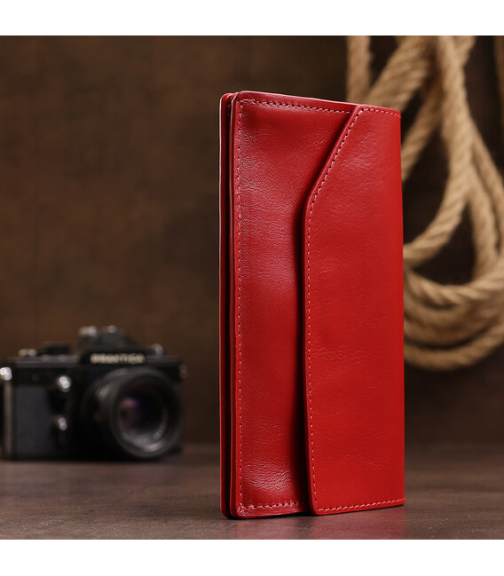 Стильне жіноче портмоне з висококласної натуральної шкіри в гладкою приємною на дотик фактурою. Має гарний злегка приглушений червоний колір, що виглядає просто шикарно. Всередині є місткі відділення для купюр, слоти для пластикових карт і візиток, а також зовнішня монетниця на блискавці. Закривається портмоне оригінальним скошеним клапаном на магніті.