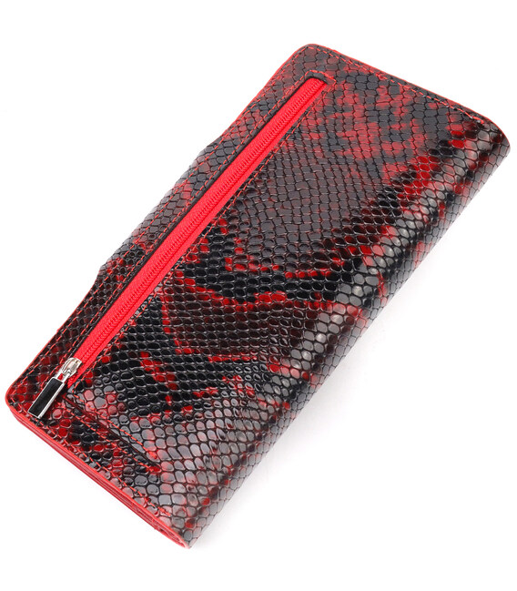 Відмінний жіночий гаманець із натуральної лакованої шкіри, з тисненням під змію, у червоно-чорному кольорі. Складається аксесуар навпіл, з фіксацією на хлястик та кнопку. Якісна фурнітура доповнює та прикрашає виріб. Такий гаманець з натуральної шкіри - це ідеальний варіант на кожен день для тих, хто цінує якість, зручність та комфорт, а також чудово доповнюватиме Ваш повсякденний образ.
