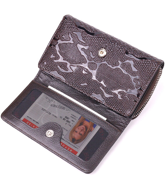 Красивий жіночий лакований гаманець в сучасному дизайні і насиченому коричневому кольорі. Виріб виконаний із натуральної шкіри високої якості. Портмоне має глибоке відділення для купюр, вісім осередків для пластикових карток, дві прилеглі кишені, два відділення під сіточкою та монетницю на блискавці зовні. Закривається аксесуар на кнопку. Цей аксесуар чудово підійде як подарунок і принесе будь-якій жінці виняткову радість.