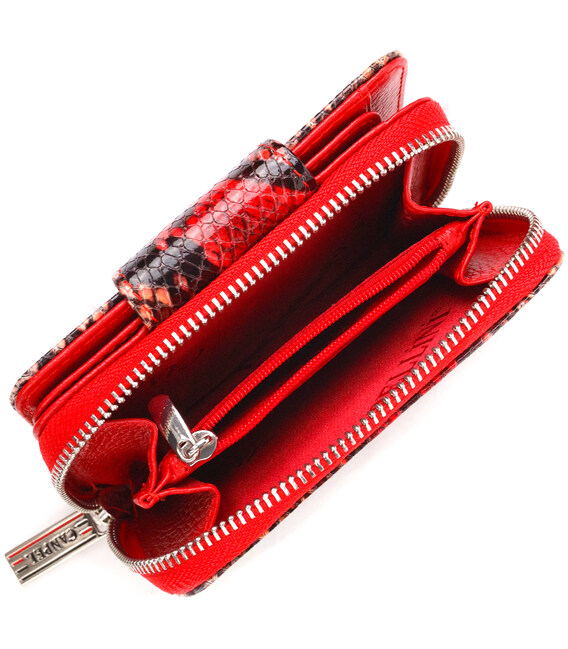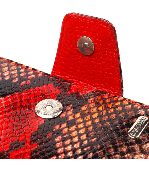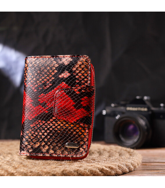 Стильний жіночий гаманець вертикального типу із натуральної шкіри з тисненням під змію. Аксесуар має відділення для купюр, вісім осередків для карток (два під сіточкою), дві прилеглі кишені та дві кишені на блискавках. Закривається аксесуар у два складання хлястиком на магніт. Купуючи шкіряний аксесуар цієї фірми собі або на подарунок, будьте певні, що він радуватиме око не один рік.