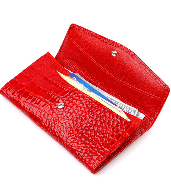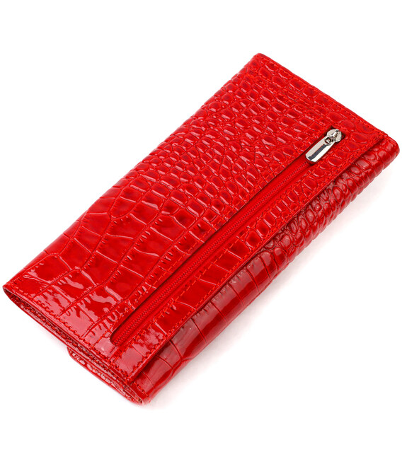 Лакований жіночий гаманець горизонтального типу із якісної натуральної шкіри з тисненням під рептилію. Аксесуар має одне основне відділення, шість кишень для карток, чотири прилеглі кишені та монетницю. Закривається аксесуар навпіл клапаном на кнопку. Купуючи шкіряний аксесуар цієї фірми, собі або на подарунок, будьте певні, що він прослужить Вам не один рік.