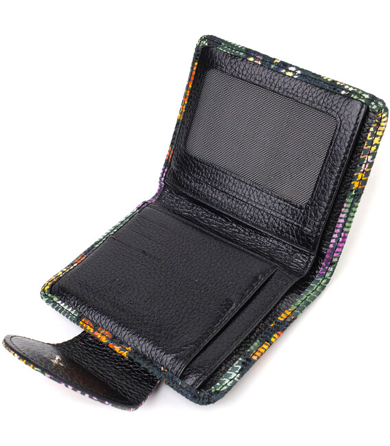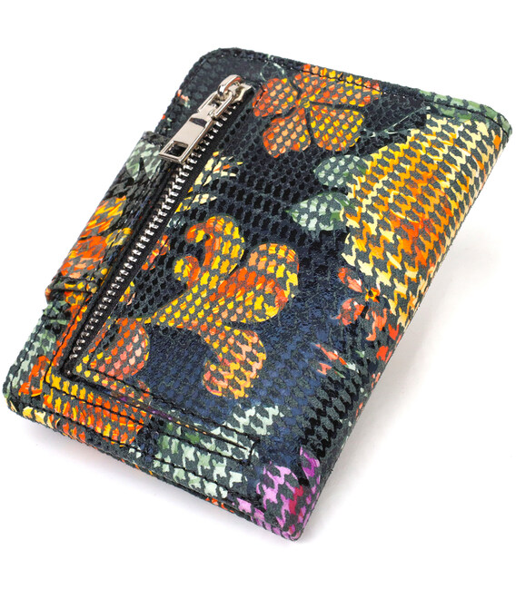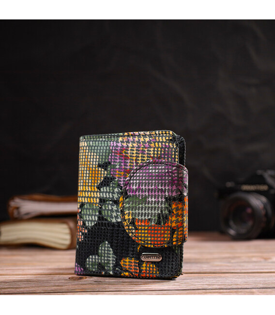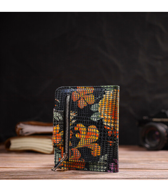 Жіночий фактурний гаманець із натуральної шкіри, виріб має барвистий квітковий принт зовні та чисто чорний усередині. Аксесуар складається з одного основного відділення з тканинною перегородкою, в яке поміщаються купюри всіх номіналів, чотирьох кишень для карток (одна під сіточкою), трьох прихованих кишень та монетниці. Закривається аксесуар навпіл хлястиком на кнопку. Купуючи шкіряний аксесуар цієї фірми, собі чи на подарунок, будьте певні, що він прослужить Вам не один рік.