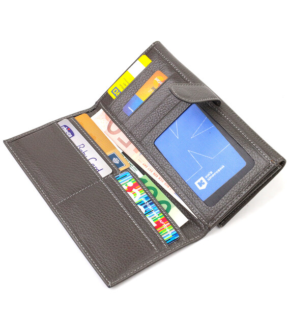 Практичний шкіряний гаманець для жінок, які люблять зручність і простоту. Аксесуар має одне основне відділення, сімнадцять кишень для карток, чотири прилеглі кишені та монетницю. Особливістю даної моделі є наявність блоку для кредитних карток, який закривається хлястиком на кнопку. На лицьовій стороні, у правому нижньому куті металевий логотип компанії виробника. Якщо ви вибрали товар цієї фірми, можете не сумніватися, що виріб прослужить дуже довго і не втратить свого первісного вигляду.