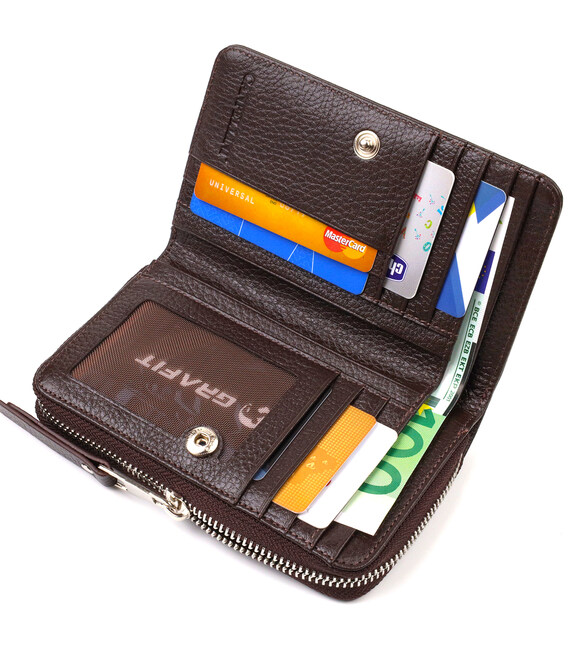 Місткий та функціональний жіночий гаманець із натуральної шкіри. Аксесуар має два відділення для купюр, вісім осередків для карток (одна під сіточкою), чотири прилеглі кишені та монетницю. Закривається аксесуар навпіл на кнопку. Купуючи шкіряний аксесуар цієї фірми собі або на подарунок, будьте певні, що він радуватиме око не один рік.