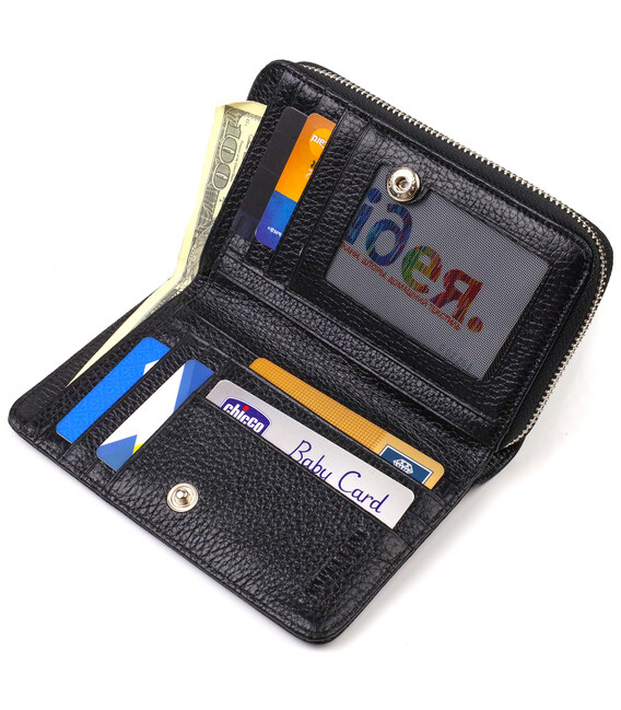 Практичний жіночий гаманець із натуральної зернистої шкіри. Аксесуар має два відділення для купюр, вісім осередків для карток (одна під сіточкою), чотири прилеглі кишені та монетницю. Закривається аксесуар навпіл на кнопку. Купуючи шкіряний аксесуар цієї фірми собі або на подарунок, будьте певні, що він радуватиме око не один рік.