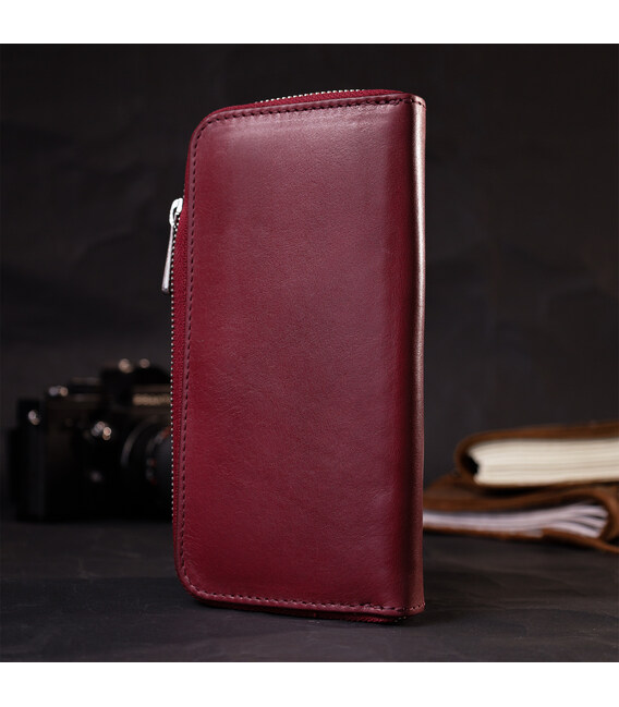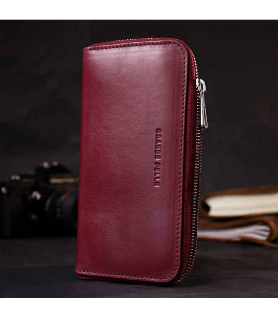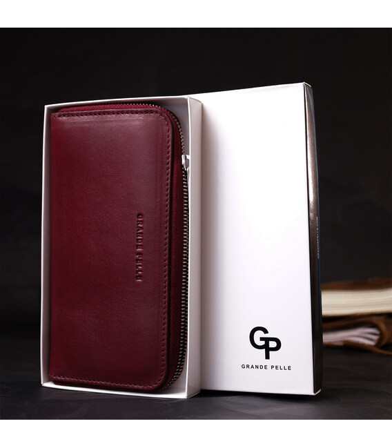 Цікавий місткий гаманець на блискавці з високоякісної натуральної шкіри. Має гарний колір марсала та гладку фактуру. Внутрішнє наповнення добре продумане та практичне, в ньому розмістяться купюри, монети, різні картки і навіть смартфон. Запакований цей гаманець у фірмову картонну коробку з логотипом бренду. Ми впевнені, що вироби української фірми Grande Pelle, нікого не залишать байдужими, і Ви ще неодноразово повернетесь за цими якісними шкіряними аксесуарами.
