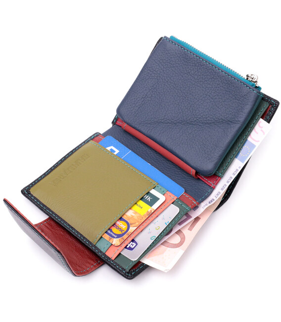 Модне вертикальне портмоне в два додавання зручного розміру з натуральної шкіри найвищої якості. Гаманець чорного кольору зовні та різнобарвний усередині, що дуже стильно та сучасно. Шкіряне портмоне дуже практичне і служить досить довго. Аксесуар складається з основного відділення зі шкіряною перегородкою для купюр, монетниці, чотирьох осередків для карт, прозорого віконця для пропуску та чотирьох прихованих кишень. Портмоне доповнено надійною фурнітурою і прошито по краю рівним рядком бірюзового кольору. Укомплектований гаманець у фірмову картонну коробку білого кольору. Виріб стане ідеальним подарунком для дівчини будь-якого віку.