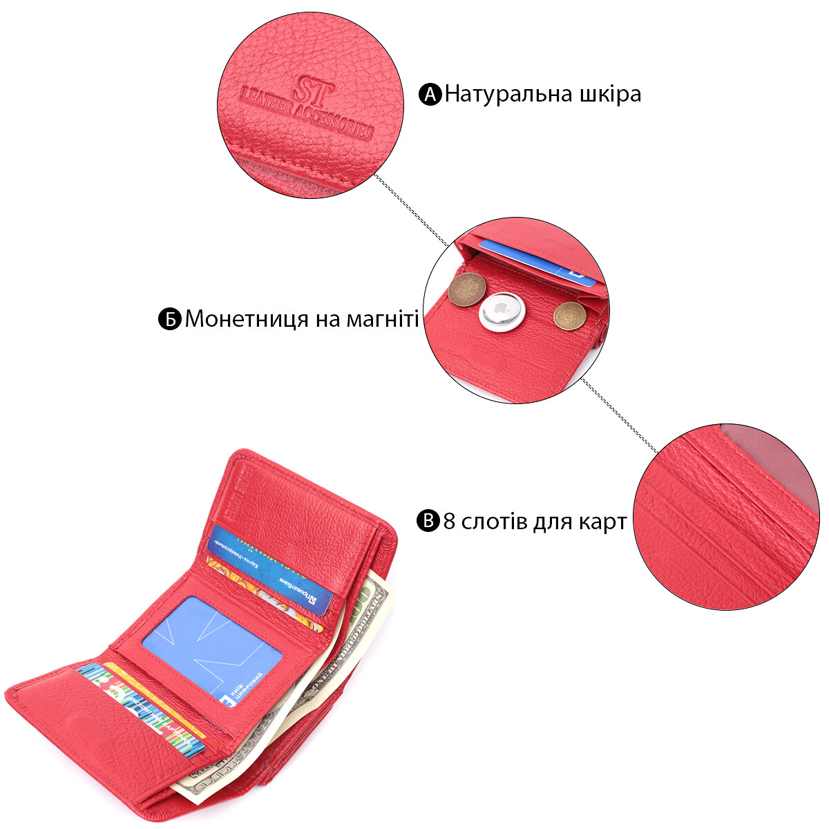 Модний жіночий гаманець із натуральної якісної шкіри. Модель має зручний розмір та закривається на магніт. Зовні можна побачити відділення монет, яке закривається клапаном на магніт. Аксесуар всередині оснащений двома відділеннями для купюр та вісьмома осередками для карт. Запакований аксесуар у білу щільну картонну коробку з фірмовим логотипом.