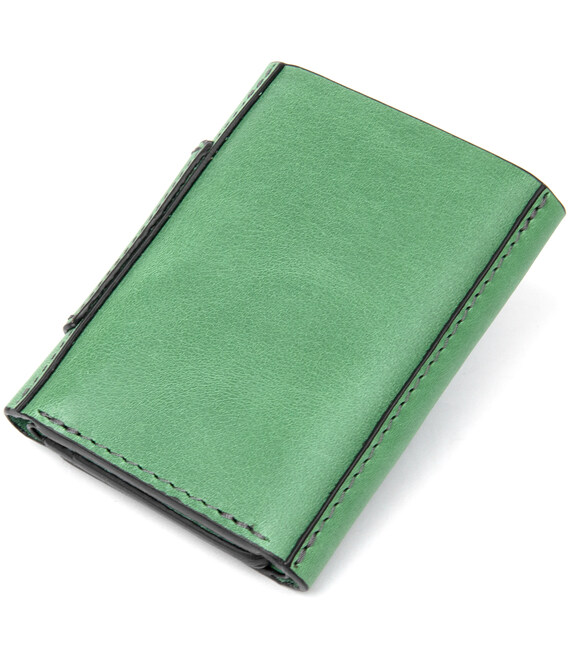 Дуже красиве портмоне в незвичайному зеленому кольорі з чорною окантовкою країв. Виконано з натуральної шкіри високого класу виконання. Закривається на зручний і практичний прихований магніт. Всередині є слоти для карток і відділення для купюр. Упаковка представлена у вигляді фірмового чохла.