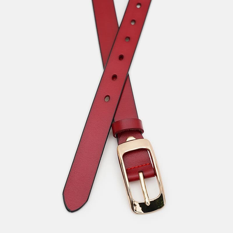 Жіночий шкіряний ремінь. Якісні матеріали, стильна пряжка й акуратний зовнішній вигляд. Ремінь зроблений із натуральної шкіри та металевої фурнітури. Лицьова сторона ременя захищена від вологи, жиру й агресивних середовищ. Догляд — мінімальний (сухе чищення). У разі потреби, ремінь можна вкоротити самостійно до потрібної вам довжини.