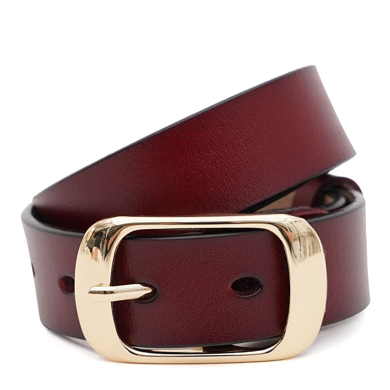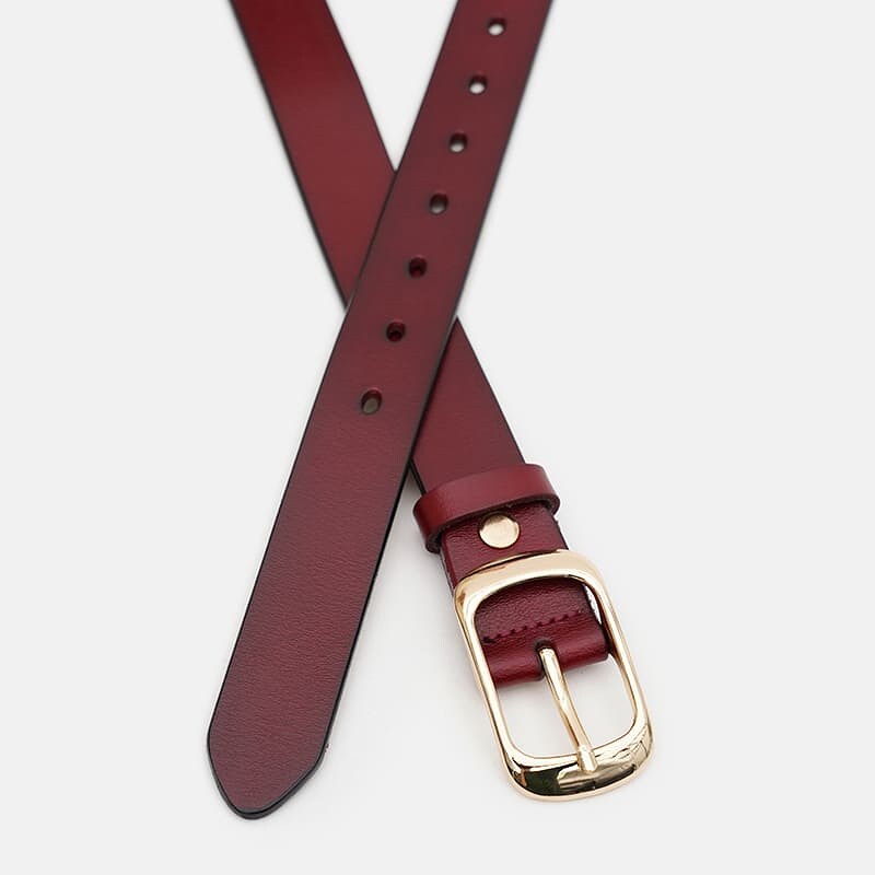 Жіночий шкіряний ремінь. Якісні матеріали, стильна пряжка й акуратний зовнішній вигляд. Ремінь зроблений із натуральної шкіри та металевої фурнітури. Лицьова сторона ременя захищена від вологи, жиру й агресивних середовищ. Догляд — мінімальний (сухе чищення). У разі потреби, ремінь можна вкоротити самостійно до потрібної вам довжини.