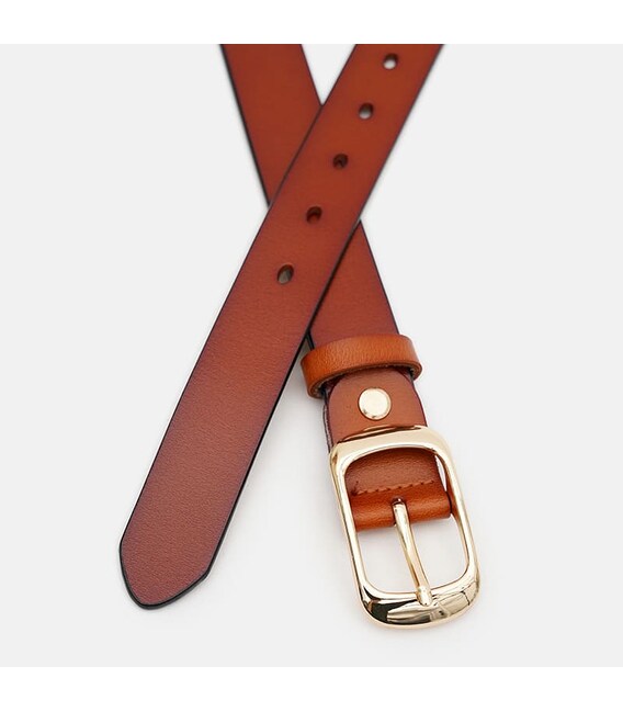 Жіночий шкіряний ремінь. Якісні матеріали, стильна пряжка й акуратний зовнішній вигляд. Ремінь зроблений із натуральної шкіри та металевої фурнітури. Лицьова сторона ременя захищена від вологи, жиру й агресивних середовищ. Догляд — мінімальний (сухе чищення). У разі потреби, ремінь можна вкоротити самостійно до потрібної вам довжини.