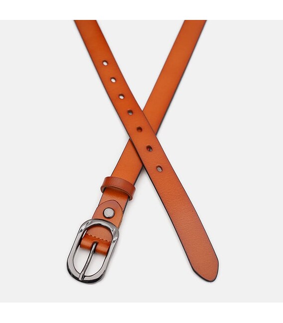 Жіночий шкіряний ремінь. Якісні матеріали, стильна пряжка та акуратний зовнішній вигляд. Ремінь виконаний з натуральної шкіри та металевої фурнітури. Лицьова сторона ременя захищена від вологи, жиру та агресивних середовищ. Догляд – мінімальний, за потреби (сухе чищення).