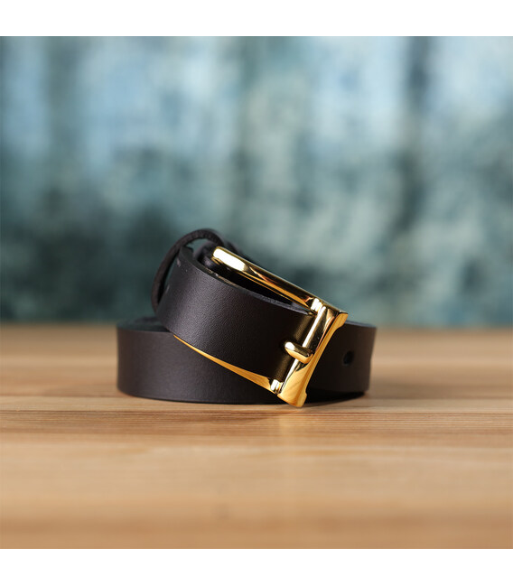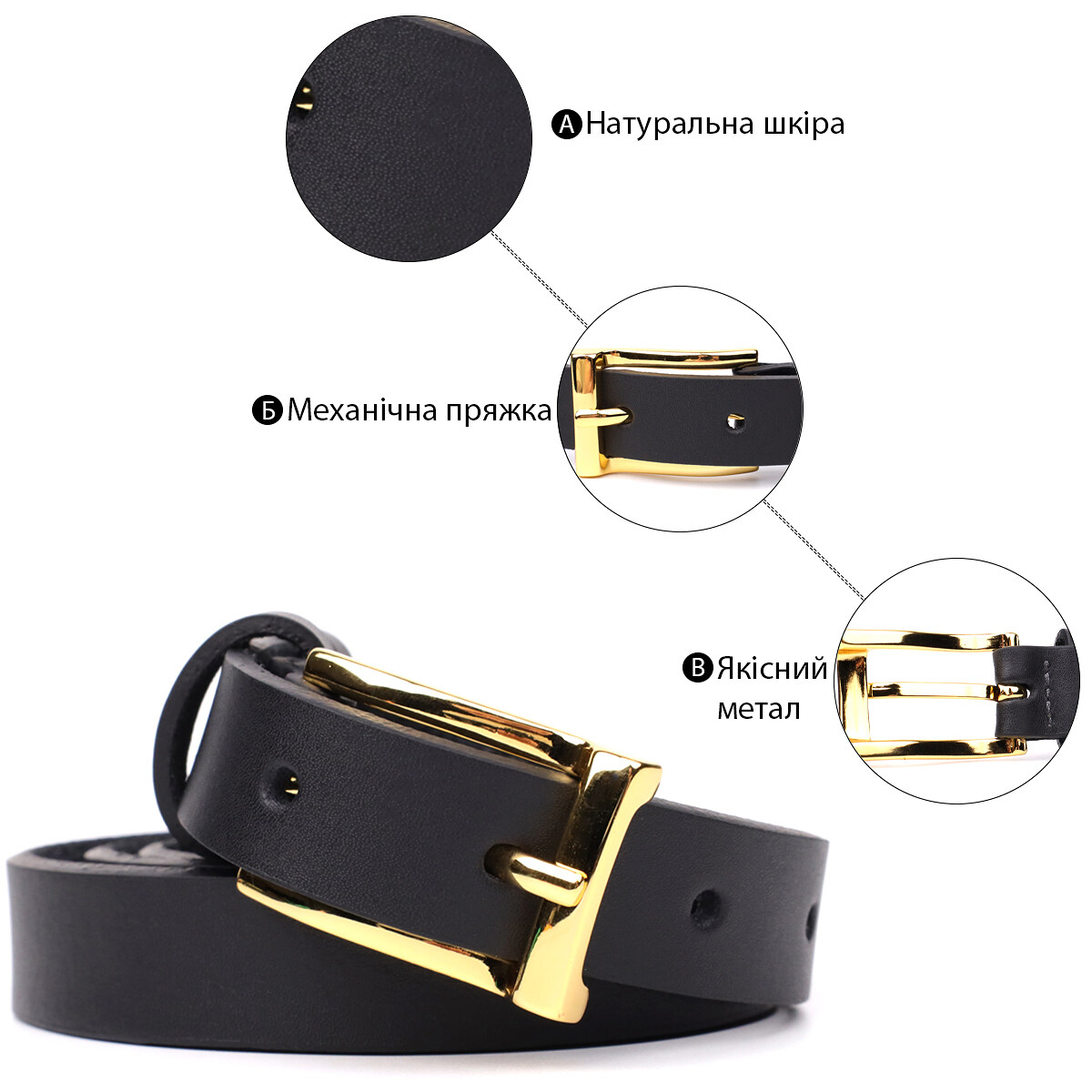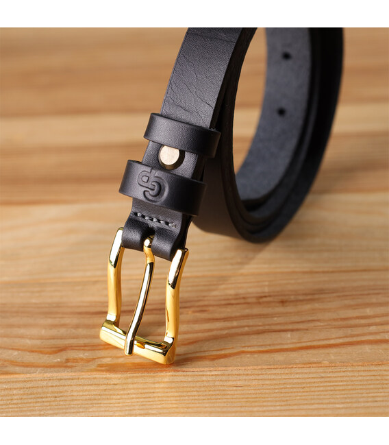 Стримана прямокутна механічна пряжка кольору під жовте золото додає ременя вишуканості та підкреслює жіночність, а тиснений логотип бренду є акцентом на оригінальність та преміальну якість виробу.