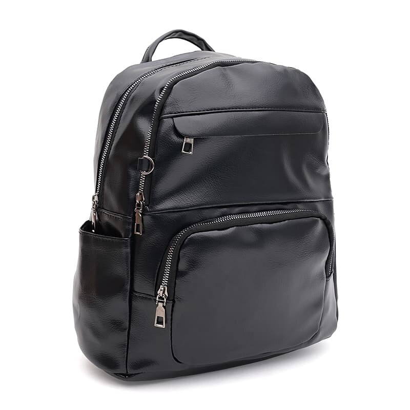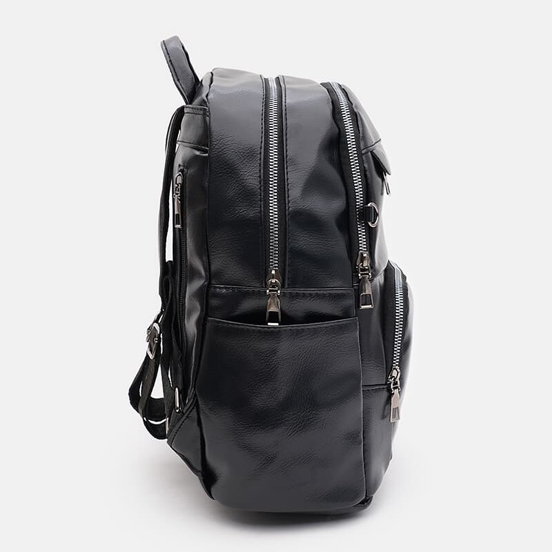 Рюкзак виконаний із штучної шкіри. Підходить для міста, навчання та подорожей. Має 1 основне відділення на блискавці. Усередині 3 кишені для телефону та дрібниць, зовні 4 кишені на блискавці. Є бічні кишені. Підкладка поліестер. Плечові ремені регулюються за довжиною.