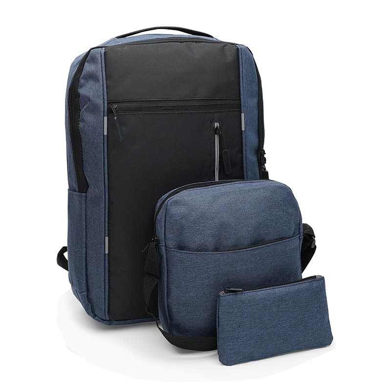 Рюкзак закривається на блискавку, має 1 відділення. Усередині 1 кишеня, зовні 2 кишені та 1 бічна кишеня. Підкладка – текстиль. Плечові ремені регулюються за довжиною. Сумка розміром 33*21*6 см закривається на блискавку, має плечовий ремінь, що регулюється. Також до комплекту входить текстильний гаманець.