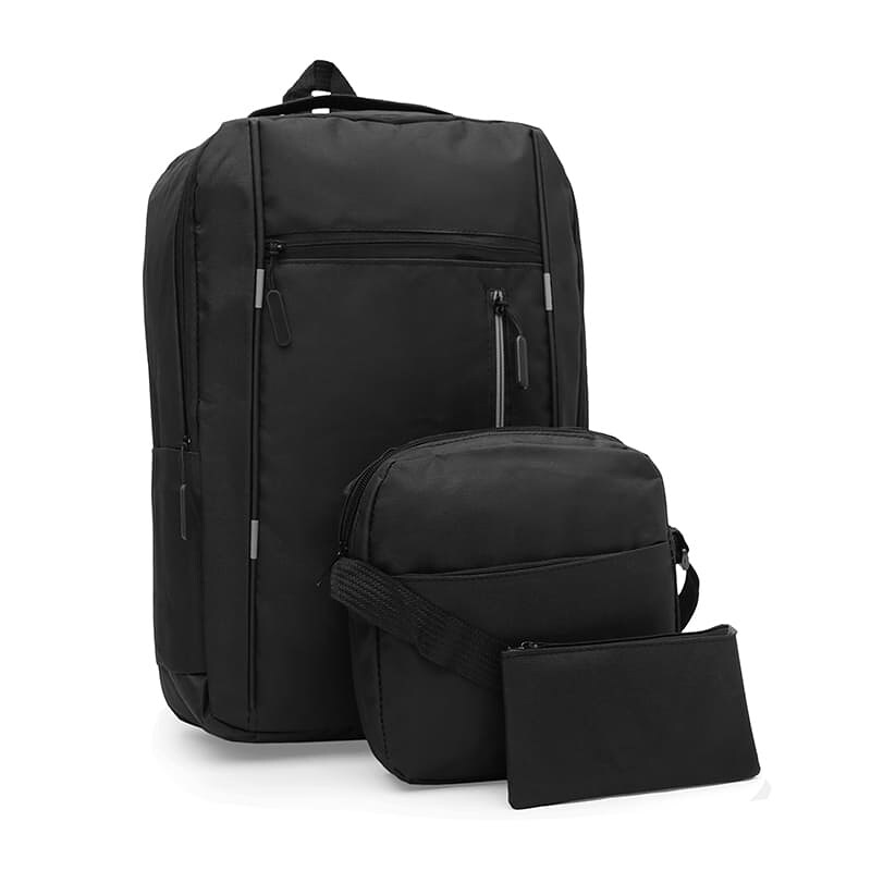 Рюкзак закривається на блискавку, має 1 відділення. Усередині 1 кишеня, зовні 2 кишені та 1 бічна кишеня. Підкладка – текстиль. Плечові ремені регулюються за довжиною. Сумка розміром 33*21*6 см закривається на блискавку, має плечовий ремінь, що регулюється. Також до комплекту входить текстильний гаманець.