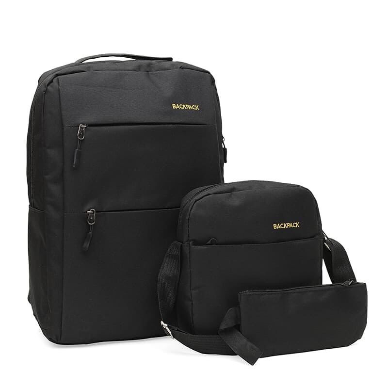 Рюкзак закривається на блискавку, має 1 відділення. Всередині 2 кишені, зовні 2 кишені на блискавці та 2 бічні кишені. Є USB роз'єм. Підкладка-текстиль. Плечові ремені регулюються за довжиною. Сумка розміром 19,5*21*6 см закривається на блискавку, має кишеню на блискавці з лицьового боку та плечовий ремінь, що регулюється. Також в комплект входить текстильний гаманець, розміром: 19*9 см.