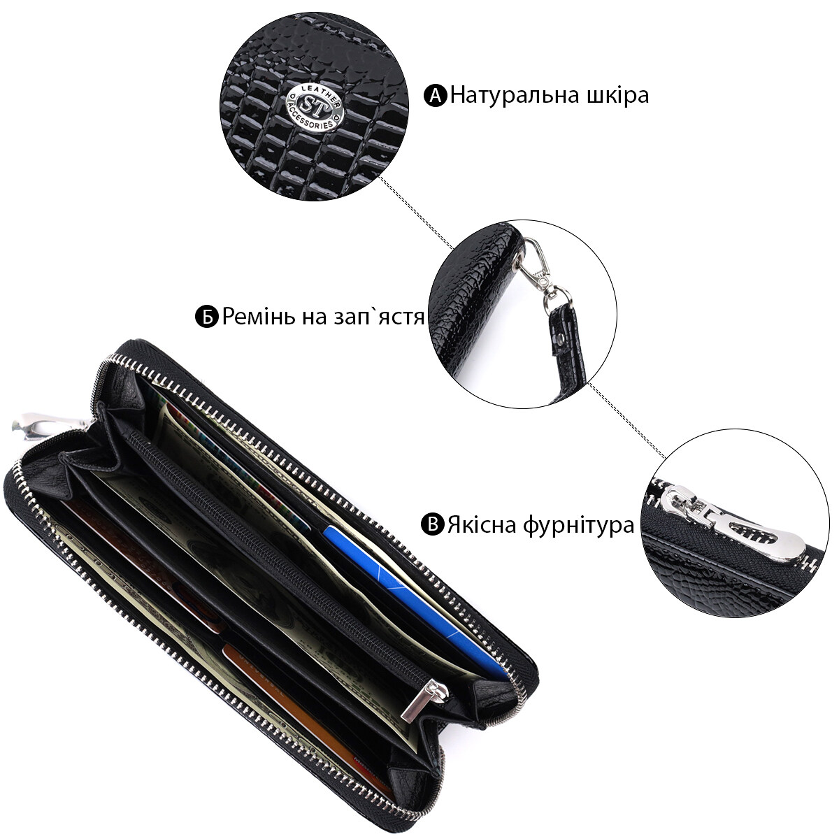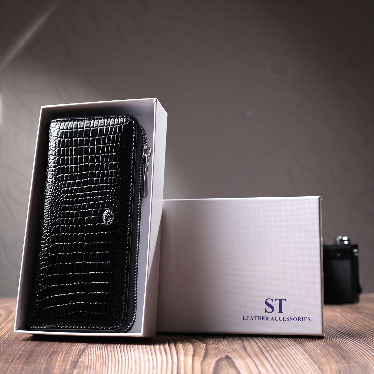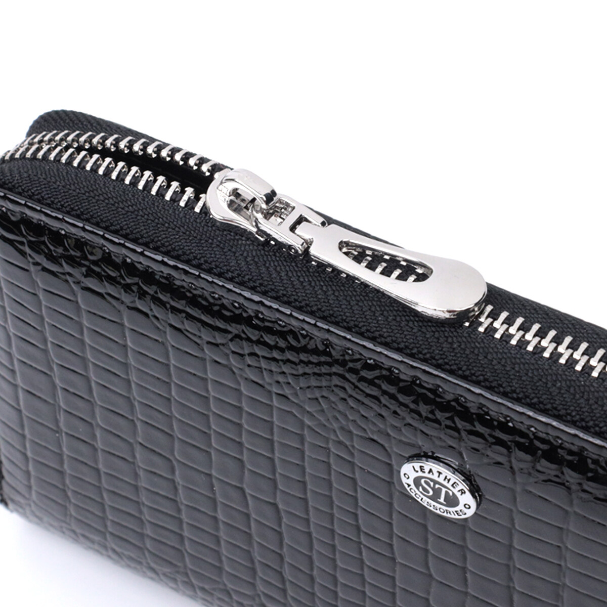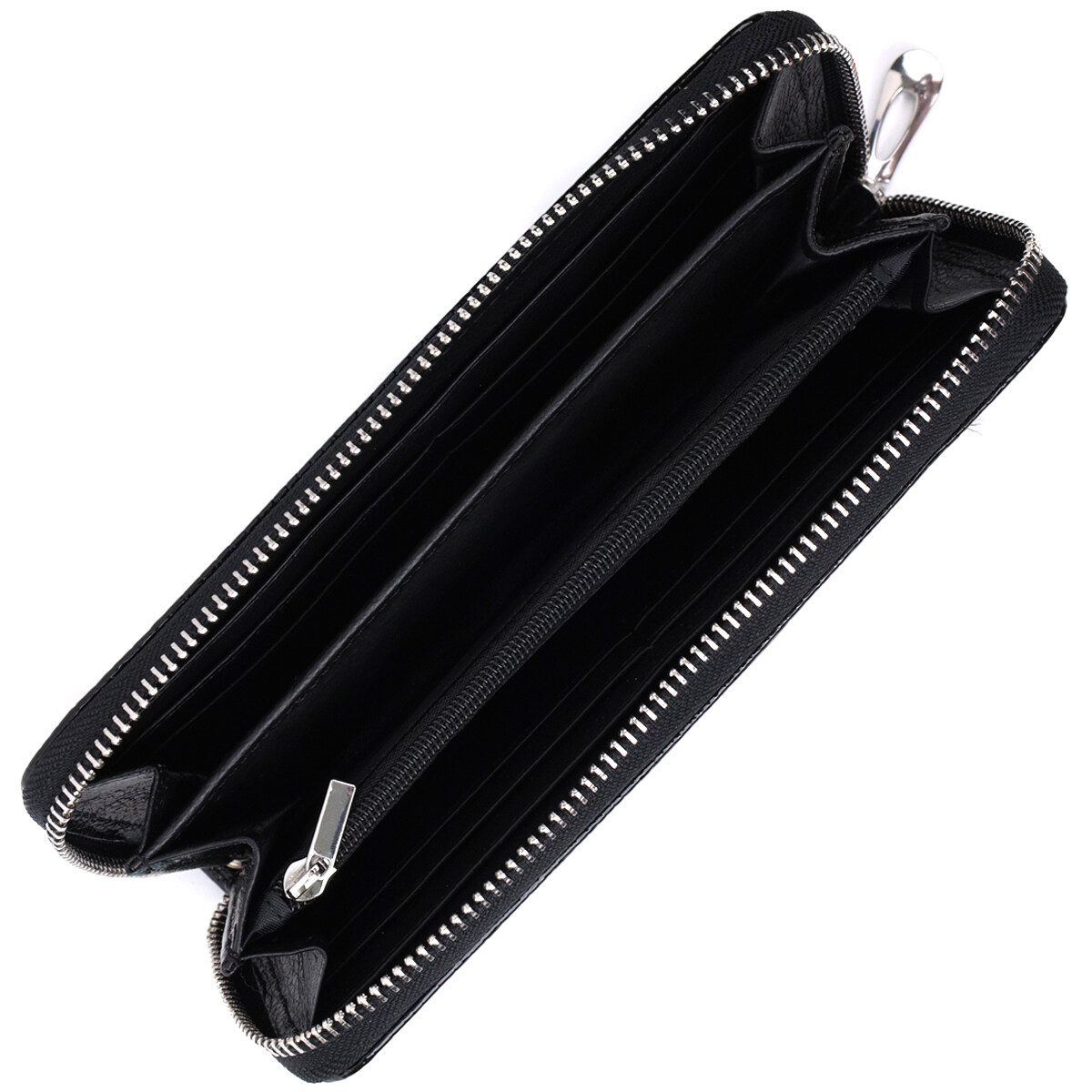 Відмінний гаманець-клатч для ділових та заповзятливих людей. Виконаний з м'якої першокласної лакованої шкіри високої якості з тисненням під рептилію. Колір виробу – чорний. Має одне основне відділення, яке закривається на блискавку. Усередині є багато відділень для купюр, осередків для карт та монетниця. Для зручності використання також передбачений знімний кистьовий ремінь. Запакований аксесуар у білу щільну картонну коробку з фірмовим логотипом.