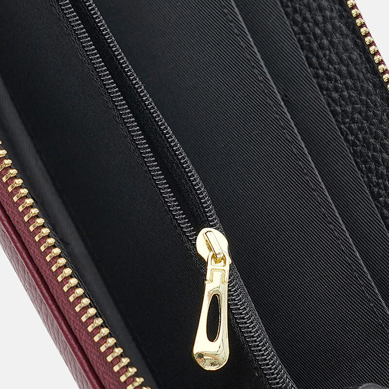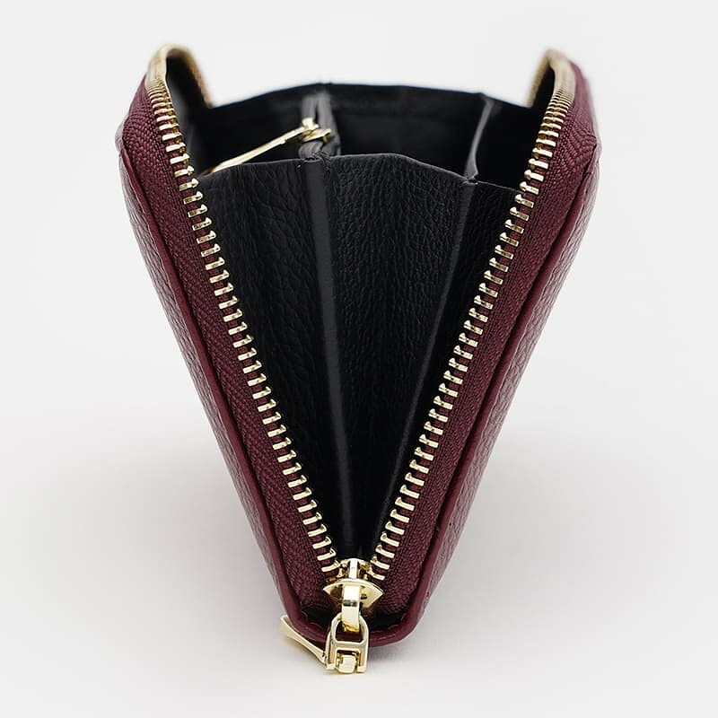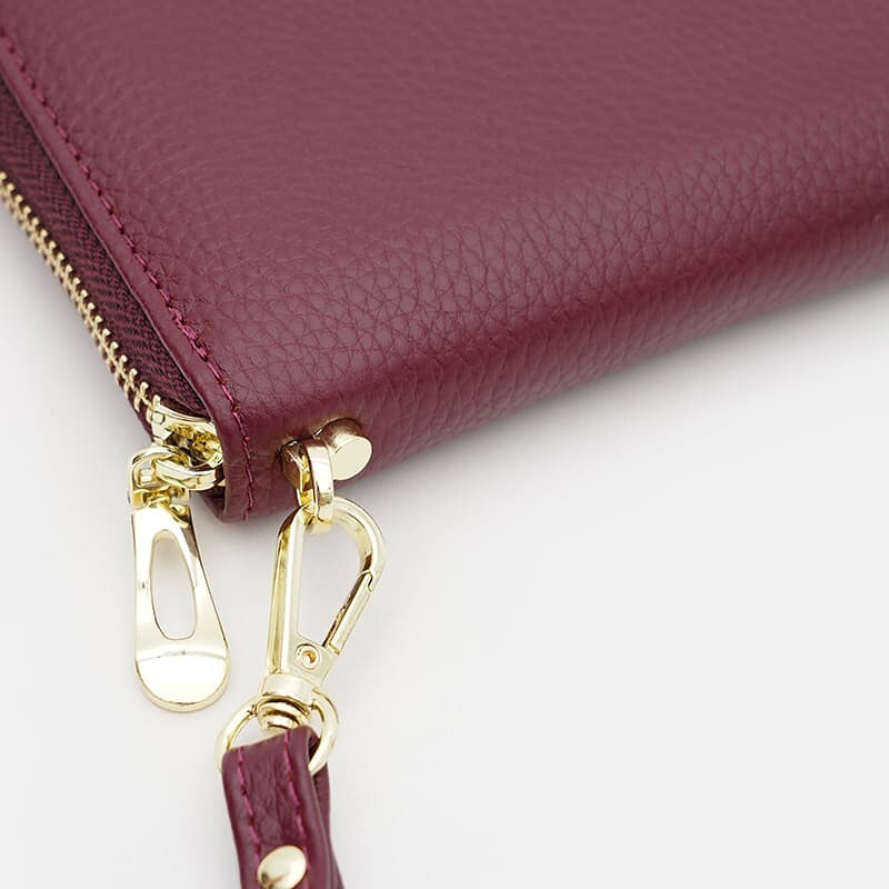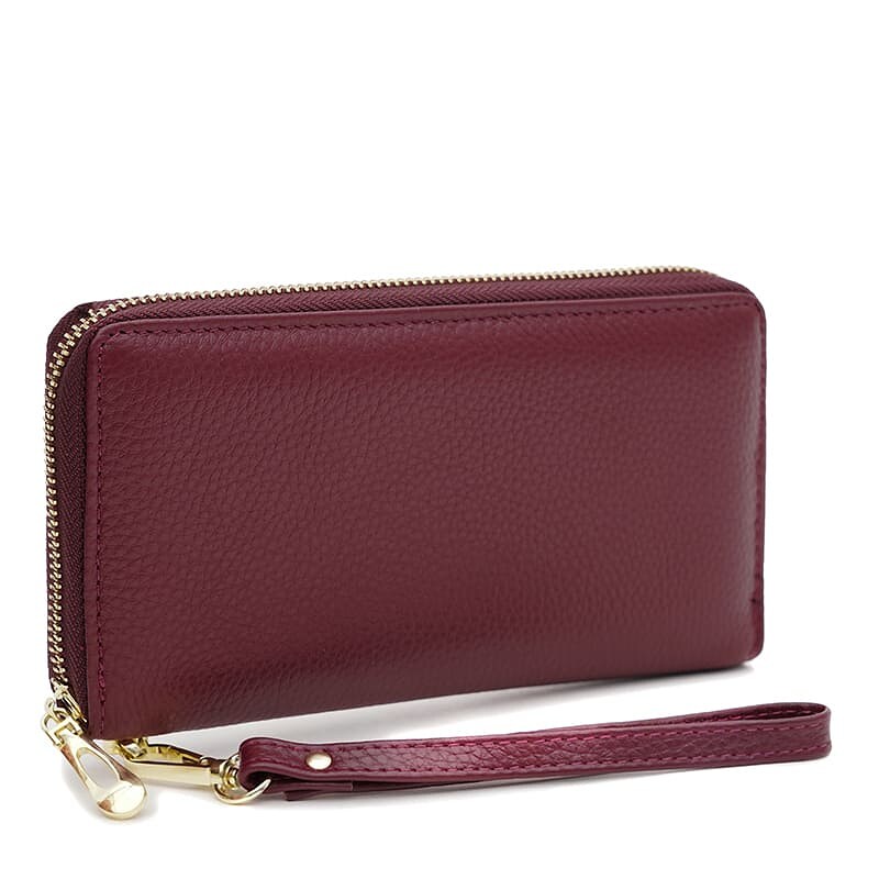 Ця модель шкіряного гаманця закривається на блискавку; Усередині: 5 відділень під купюри, 8 відділів під карти та 1 відділ-монетниця; Підкладка: Текстиль.
