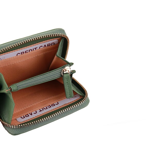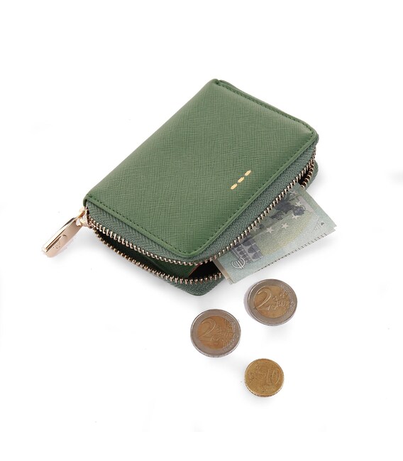 Стильний аксесуар, закривається зовнішньою металевою блискавкою, що йде по всій бічній стороні. У гаманці є два відділення для купюр, відділення для монет, що закривається на блискавку і слоти для кредитних карт з RFID-захистом від шахрайства.