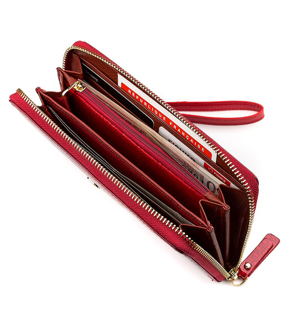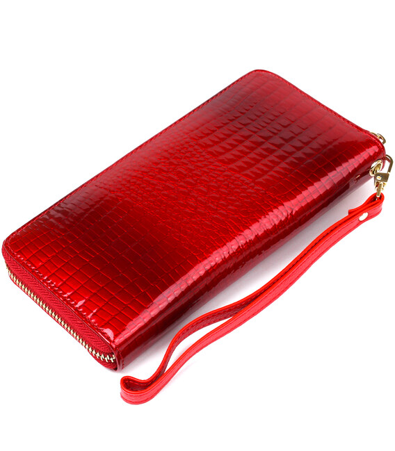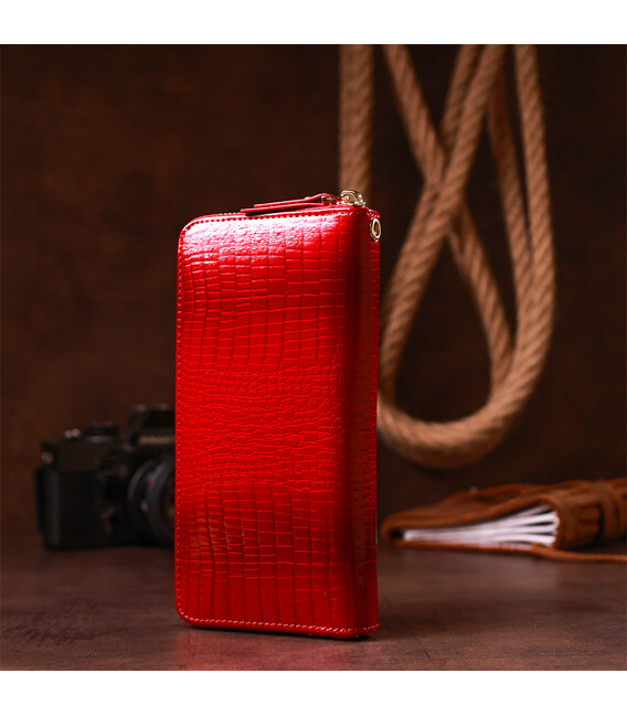 Представлена модель гаманця виконана з натуральної та екологічно чистої шкіри, має компактні розміри і шикарний червоний колір. Аксесуар зможе надати індивідуальності при достатній функціональності зі спеціальними відділеннями для паперових купюр, платіжних карт і монет. Прикрасить гаманець і фірмовий логотип на лицьовій стороні, візерунок у вигляді крокодилячої шкіри, лаковане покриття і ремінець на зап'ястя. Даний аксесуар прекрасно підійде в якості подарунку і принесе будь-якій жінці виняткову радість.