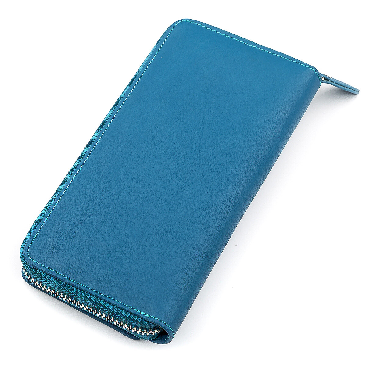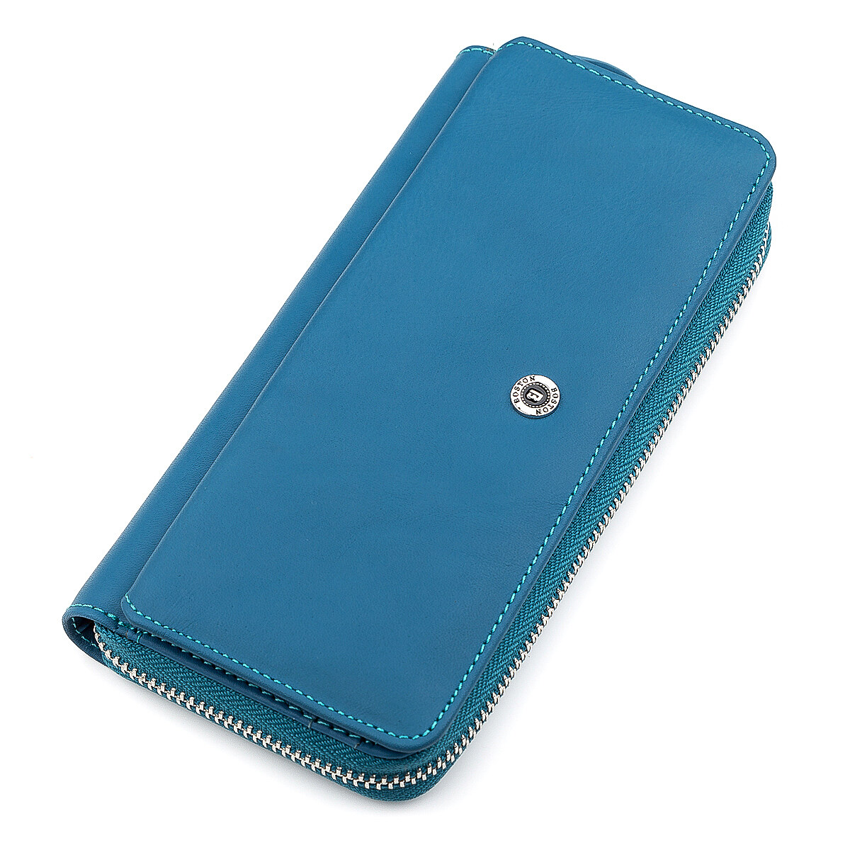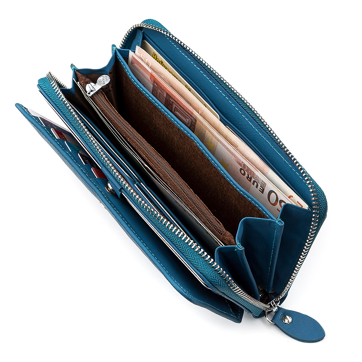 Представлена модель виконана в красивому бірюзовому відтінку, з якісної, натуральної шкіри. Закривається аксесуар на блискавку, що дозволяє на вищому рівні забезпечити безпеку вмісту, якого може бути дуже багато, адже завдяки непоганим розмірами доступна відмінна місткість. Зовні є також додатковий блок для платіжних карт, яких можна розміщувати 18 штук, разом з внутрішніми слотами. Порадує багатьох і приваблива упаковка, оформлена у фірмовому стилі з логотипом бренду.