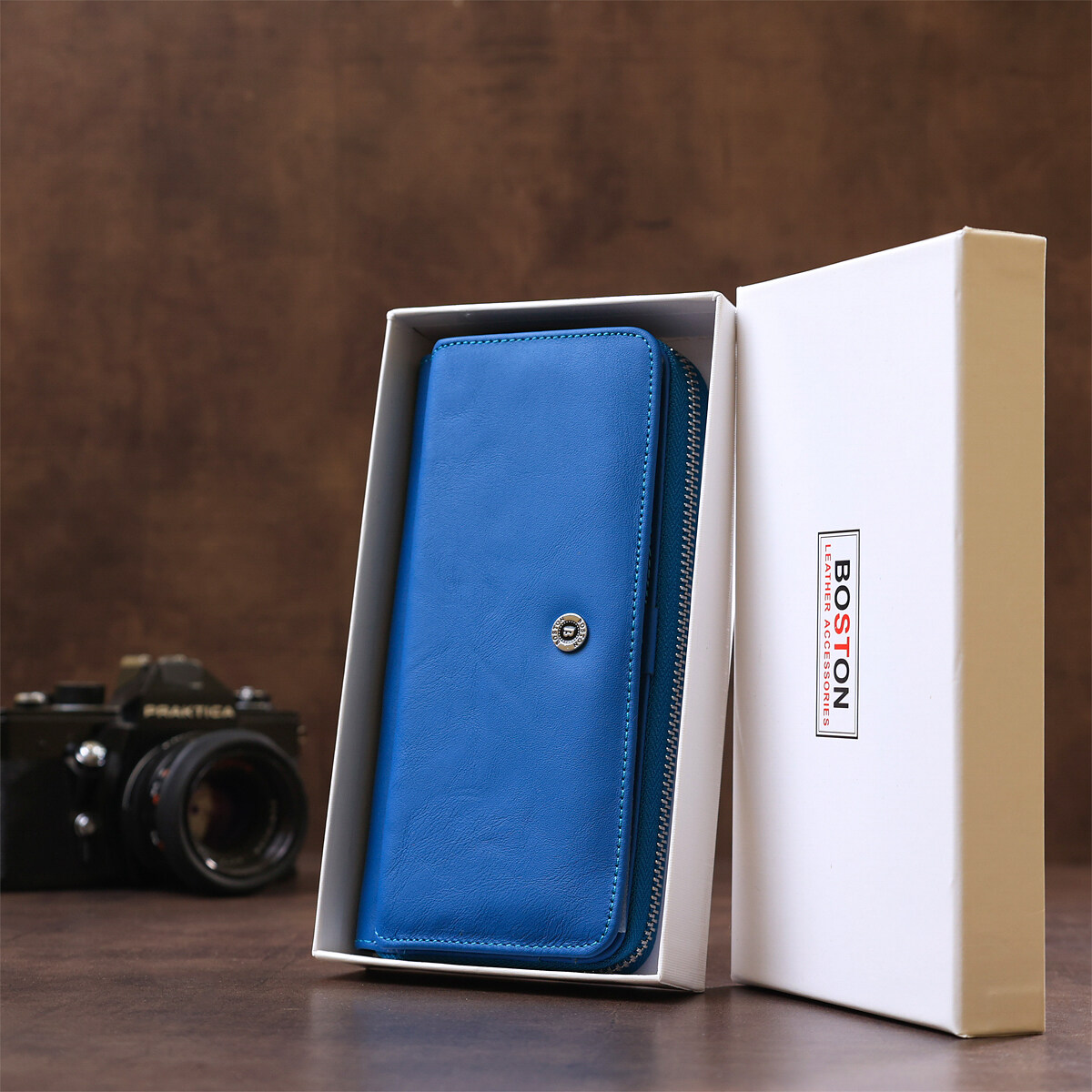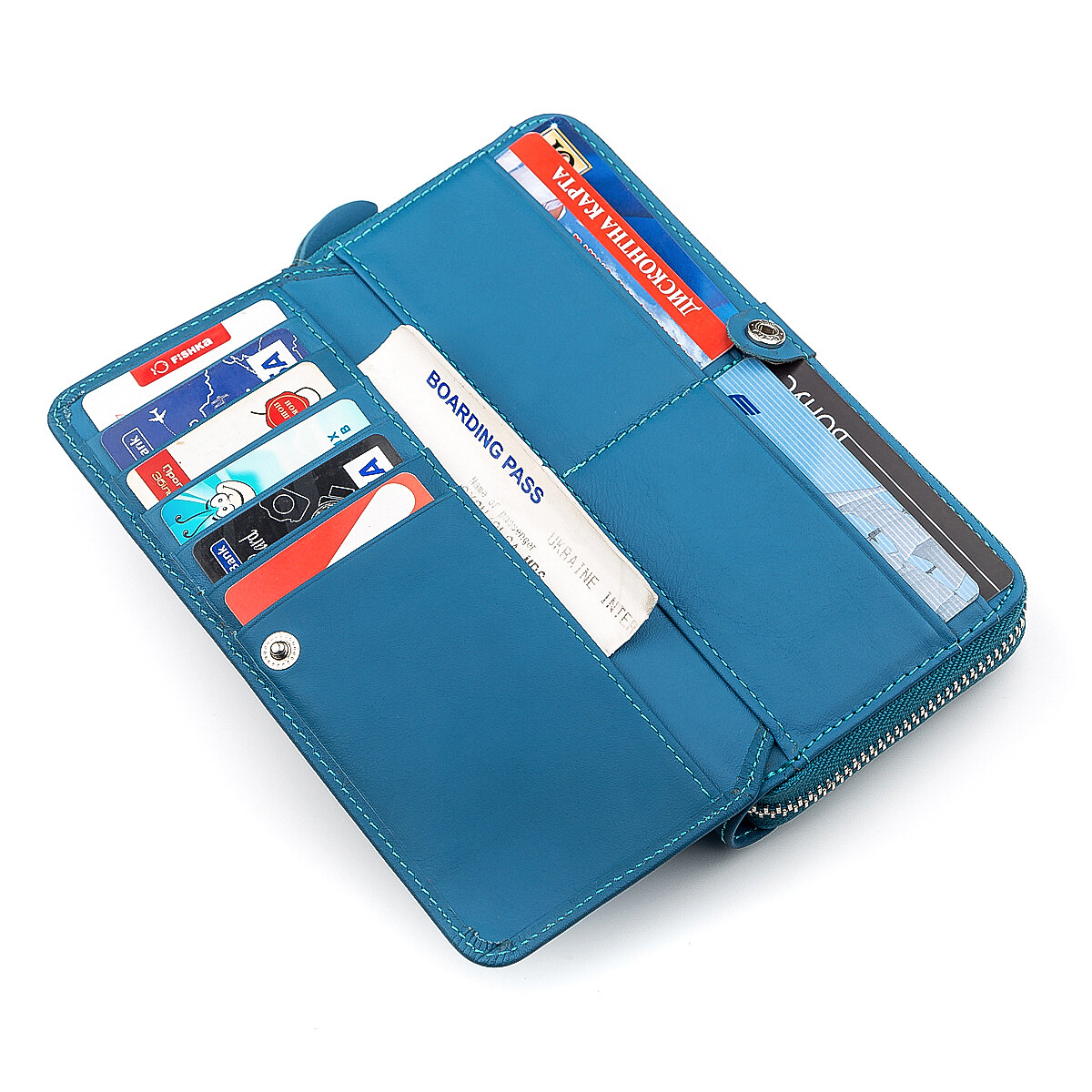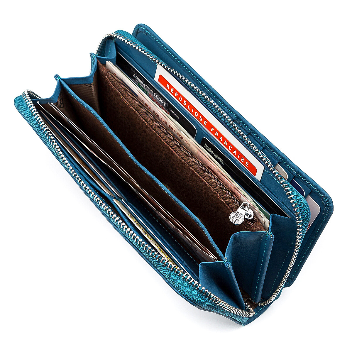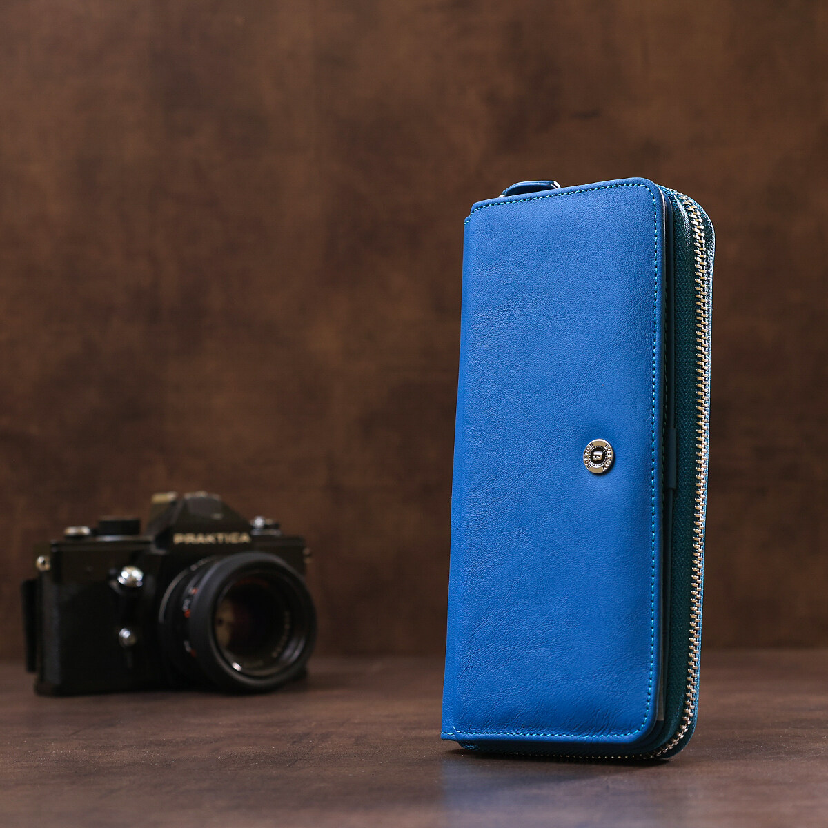 Представлена модель виконана в красивому бірюзовому відтінку, з якісної, натуральної шкіри. Закривається аксесуар на блискавку, що дозволяє на вищому рівні забезпечити безпеку вмісту, якого може бути дуже багато, адже завдяки непоганим розмірами доступна відмінна місткість. Зовні є також додатковий блок для платіжних карт, яких можна розміщувати 18 штук, разом з внутрішніми слотами. Порадує багатьох і приваблива упаковка, оформлена у фірмовому стилі з логотипом бренду.