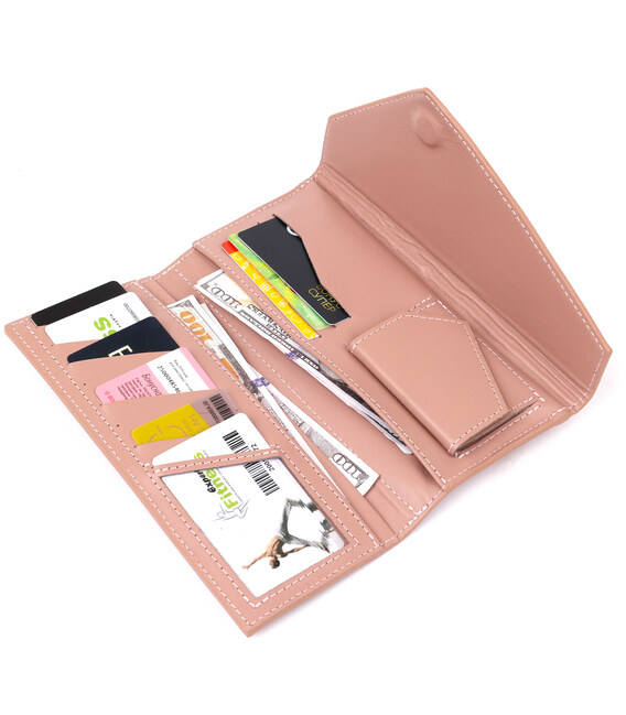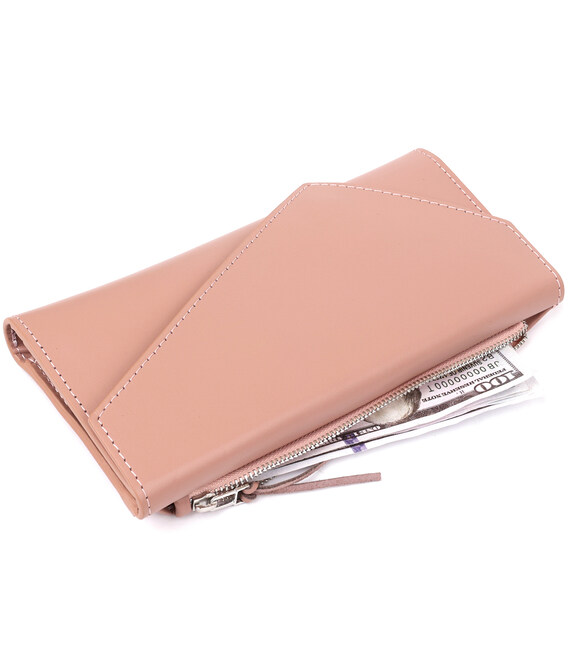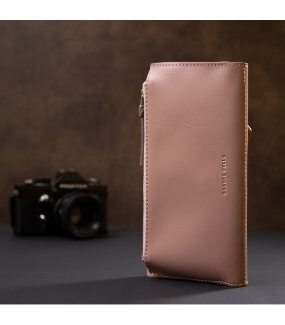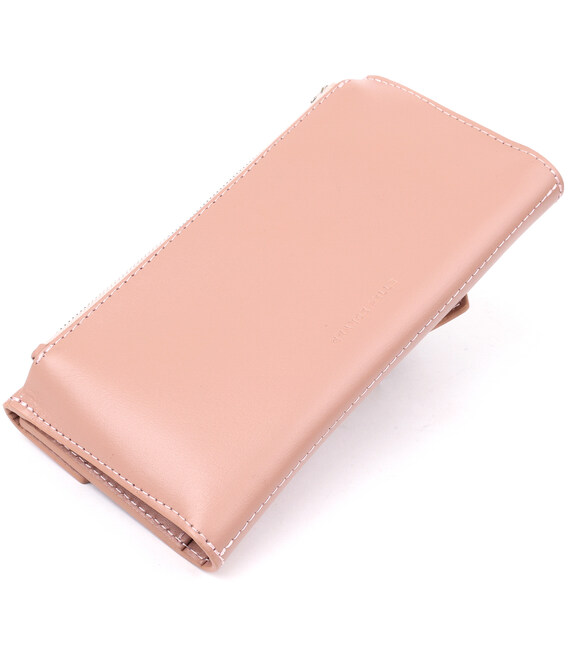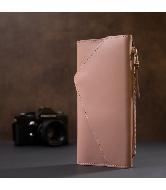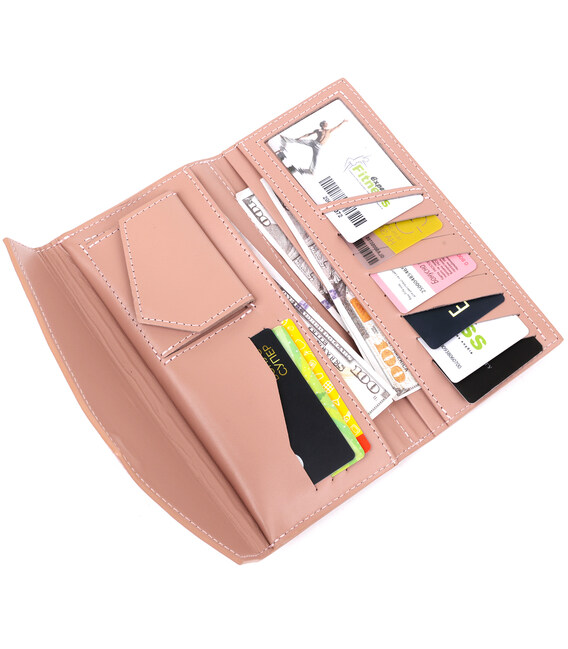 Практичний жіночий гаманець, який за своєю функціональністю дуже нагадує клатч. Має місткі відділення для купюр, монет, пластикових карток та ін. Матеріал виготовлення - натуральна зносостійка шкіра. Колір виробу - ніжно-рожевий, який виглядає дуже красиво і жіночно. Даний гаманець, безсумнівно - дуже хороший подарунок коханій жінці.