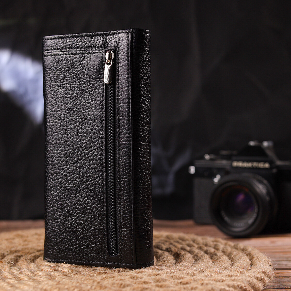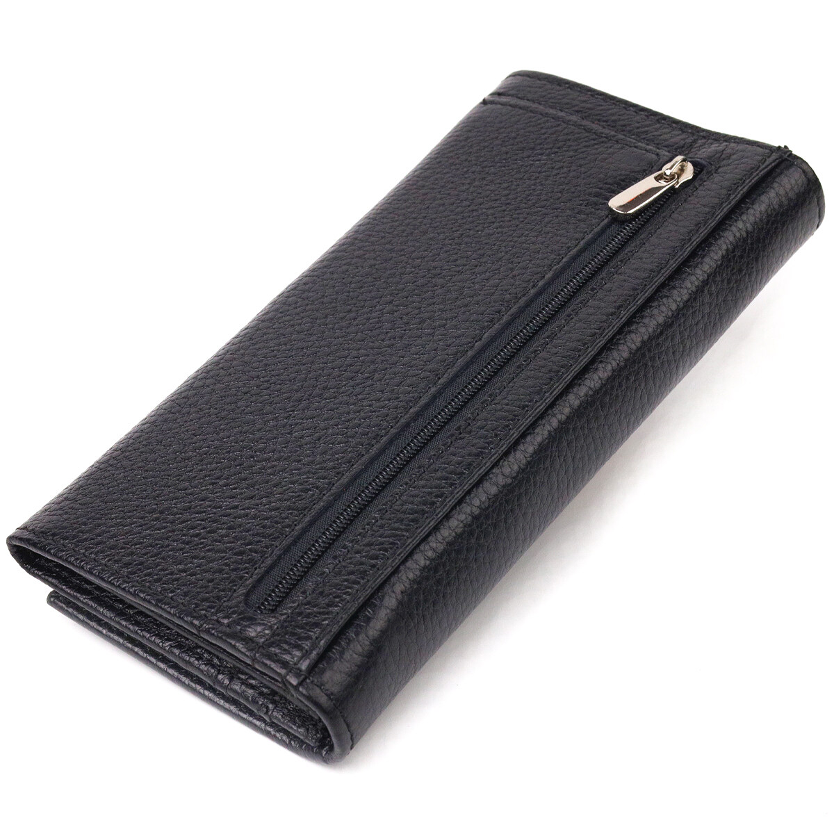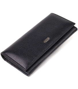 Виріб виконаний з натуральної зернистої шкіри чорного кольору. Матеріал приємний на дотик, виглядає стильно і добре підходить для щоденного використання. Горизонтальний формат робить модель зручною для тих, хто цінує місткість і порядок у речах.